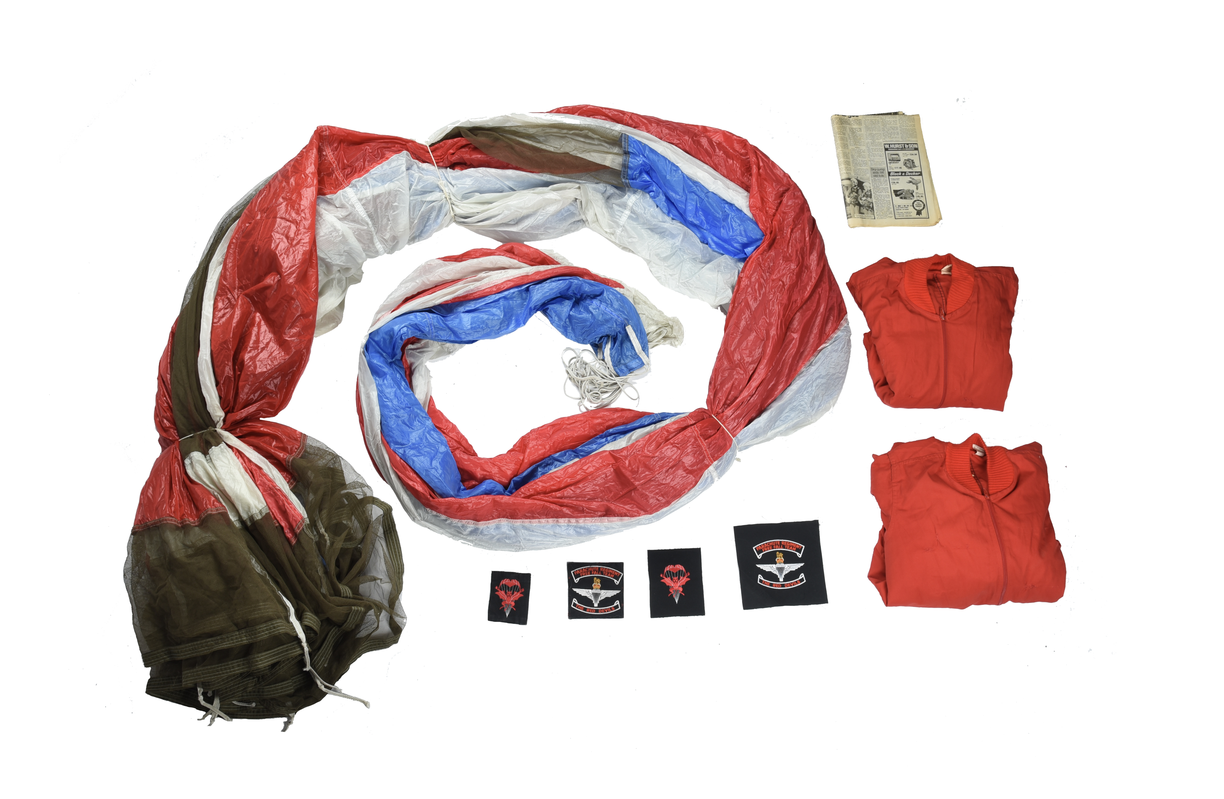 Red Devils (Parachute Regiment) parachute display team: a remarkable collection of original equipment and memorabilia obtained by the current vendor at and around the time that he participated in a charity jump with the Red Devils over the Isle of Wight in September 1986, comprising: a conical parachute, panels of red, white and blue with sections of olive green mesh; two Red Devils jumpsuits, de-badged; a fabric devil badge together with a fabric badge displaying the Parachute Regiment insignia with the Red Devils' titles, both used; examples of the same fabric insignia, un-issued, together with a union flag badge; a boxed Action Man Red Devil figure and another action man Red Devil from the 40th Anniversary 'Nostalgic Collection' range - also in original box; two photographs of the vendor making his decent; and a copy of the Isle of Wight County Press, 26th September 1986, with coverage of the charity jump and a photograph of civilian participants including the vendor. [qty]