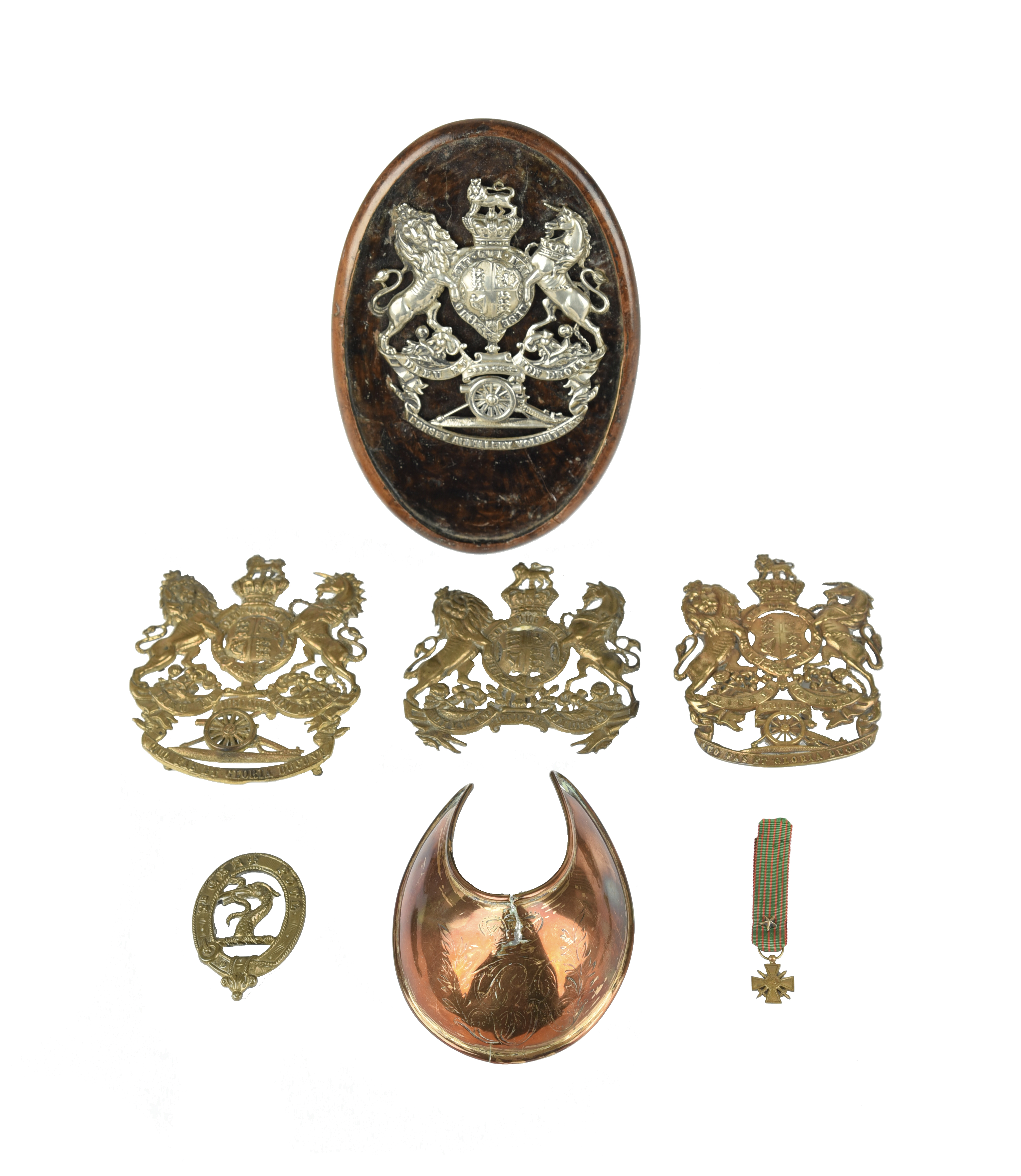 A small collection of militaria, comprising: a George III copper officer's gorget, of characteristic deeply curving crescent-shape and engraved with the royal cypher; a scarce Dorset Artillery Volunteers helmet plate, silver-plated brass, mounted for display on an oval wooden easel stand; three Victorian Royal Artillery brass helmet plates; a livery badge displaying a crest in the form of a serpent devouring a smaller such beast all encircled by an oval garter with the motto 'YE GRET POVL'; and a French dress miniature Croix de Guerre. [7]