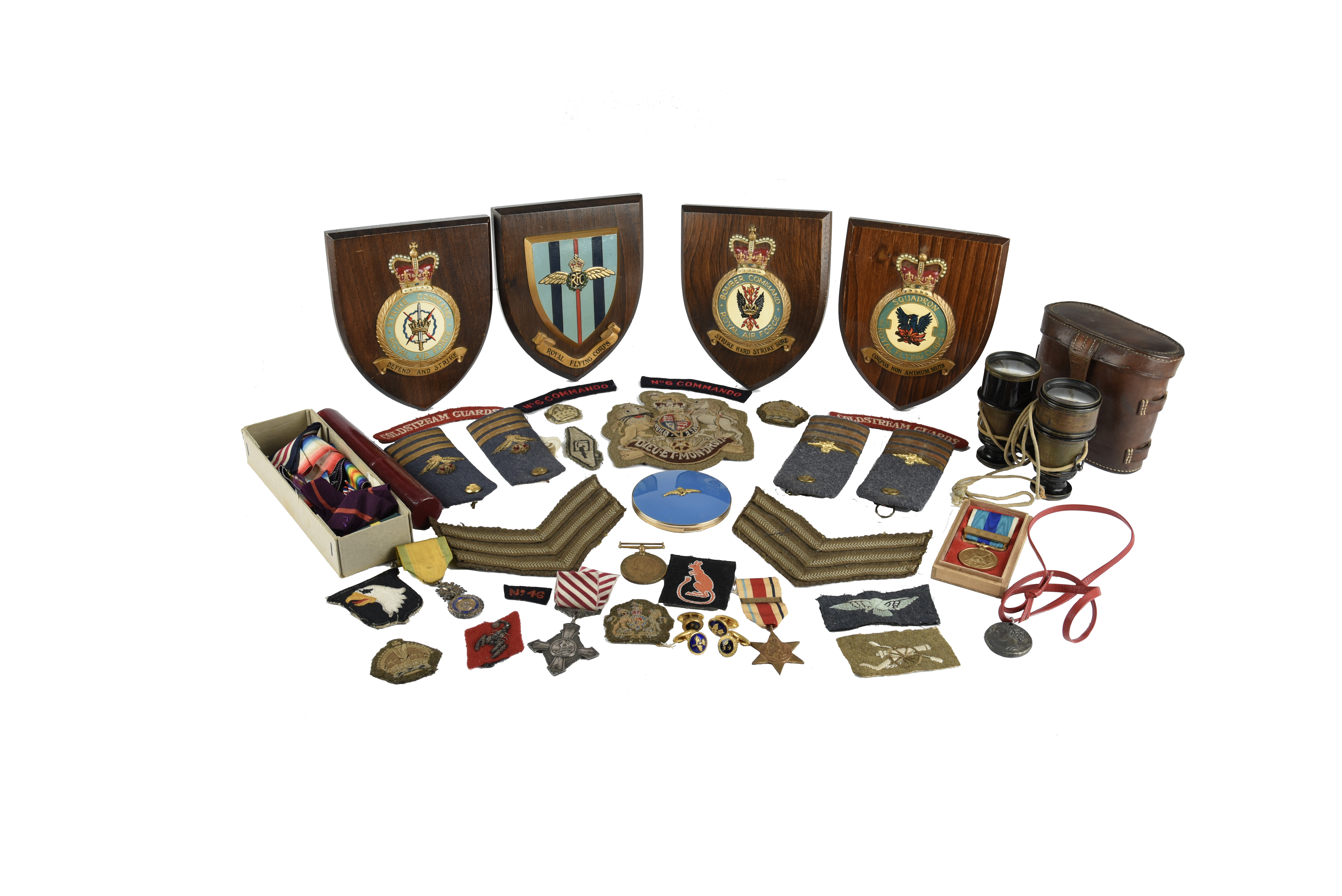 A good quantity of insignia and other militaria, including: a Sergeant Major's sleeve badge attributed (by an MS label) to Sergeant Major T. Edwards, 1st Foot Guards, killed at the Somme 1916; a Mercantile Marine War Medal (JOSEPH BENNETT); a quantity of Second World War campaign stars and medals; a small collection of medal ribbons including M.C. and Great War campaign awards; Japan: a Russo-Japanese war campaign medal, in box of issue; and other items. [qty]