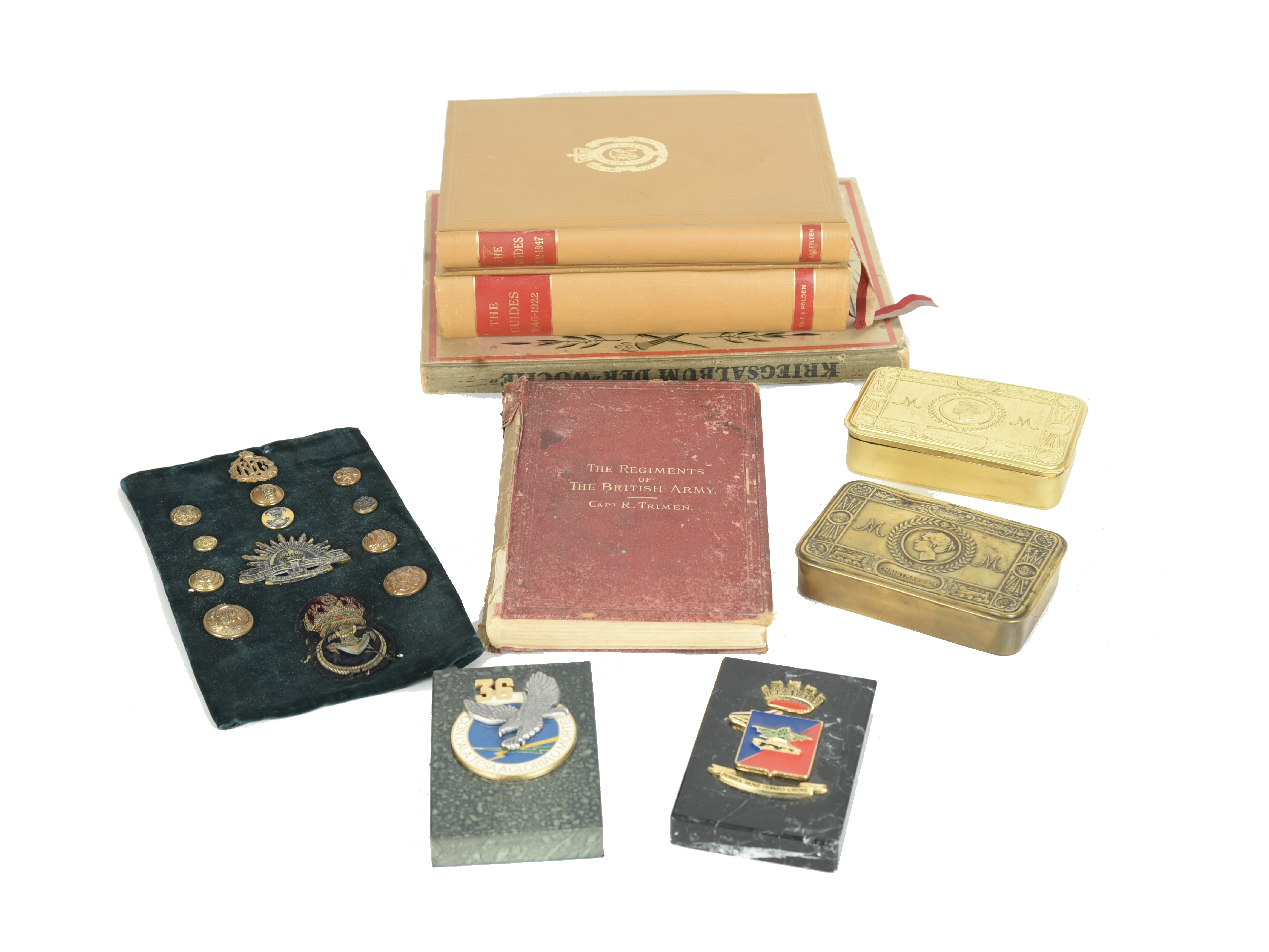 A assortment of books and militaria, including: Lieutenant-General Sir George MacMunn, K.C.B., K.C.S.I., D.S.O., 'The History of the Guides', two volumes, covering the history of the Corps of Guides from its founding in India by Lieutenant-General Sir H. B. Lumsden, K.C.S.I., C.B., until 1947, Gale & Polden, Aldershot, 1950; two Princess Mary 1914 gift tins, one with associated contents comprising: a 'Challenger' pipe in paper wrapper, an opened packet of cigarettes, and the greetings card and photograph in envelope; a small collection of cap badges and other insignia; Captain R. Trimen, 'The Regiments of the British Army'; and other items.