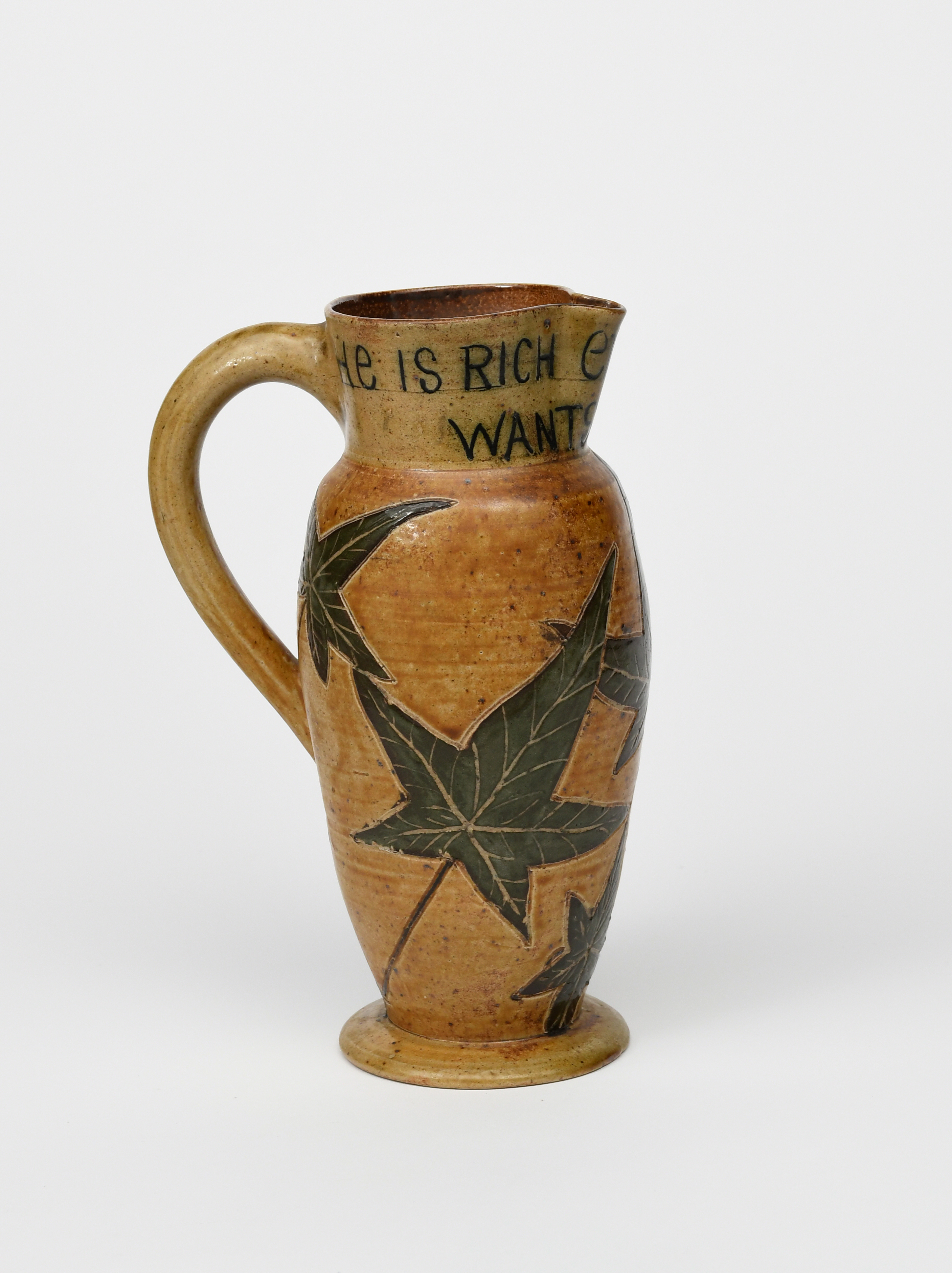 A Martin Brothers stoneware Motto jug by Robert Wallace Martin, shouldered, slender cylindrical form incised and painted with leaves, the flaring neck inscribed He is Rich Enough Who Wants Nothing, in shades of green and ochre on a buff ground, incised R W Martin, London & Southall, professional restoration to rim, 24.5cm. high