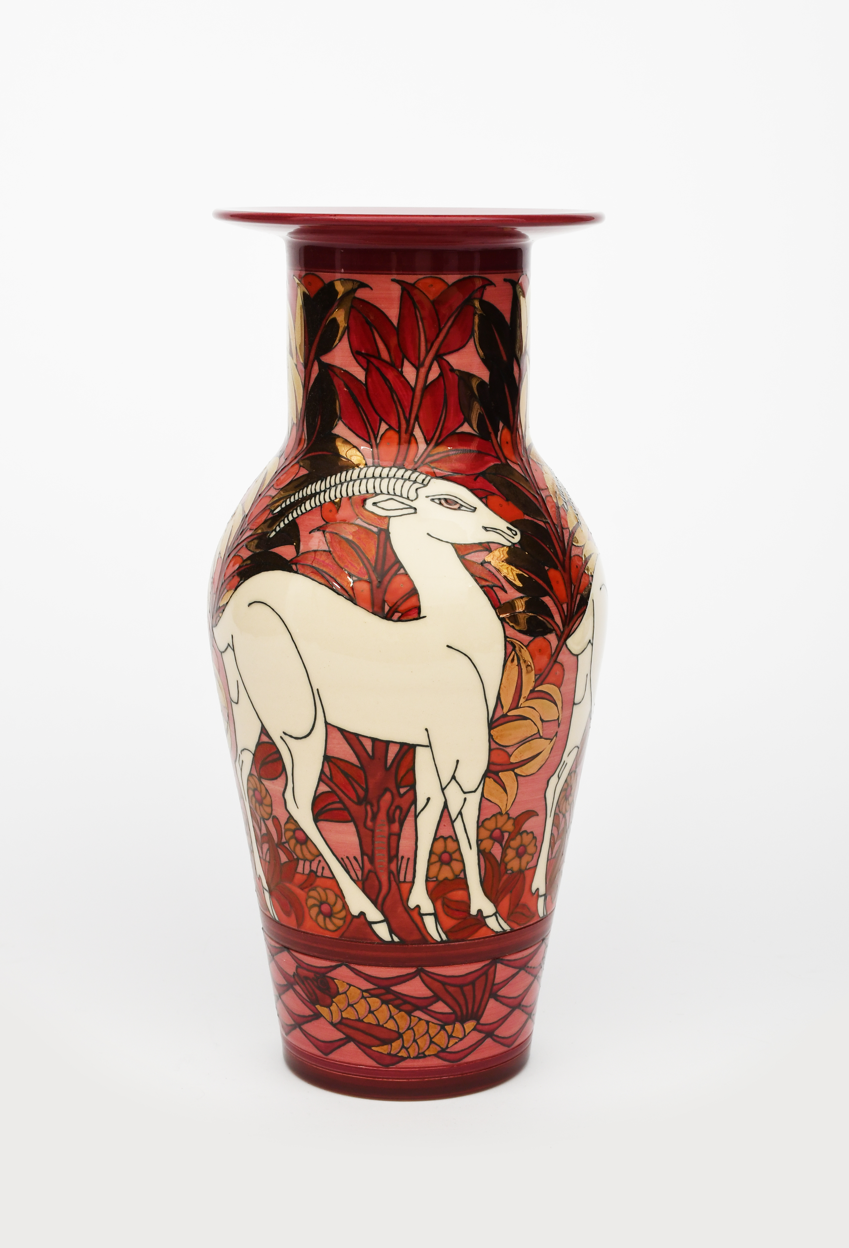 'Antelope after William De Morgan' a Dennis China Works limited edition Etruscan vase designed by Sally Tuffin, dated 2006, shouldered form, glazed in shades of red and pink with golden lustre leaves, impressed and painted marks, numbered 2/25, 35.5cm. high