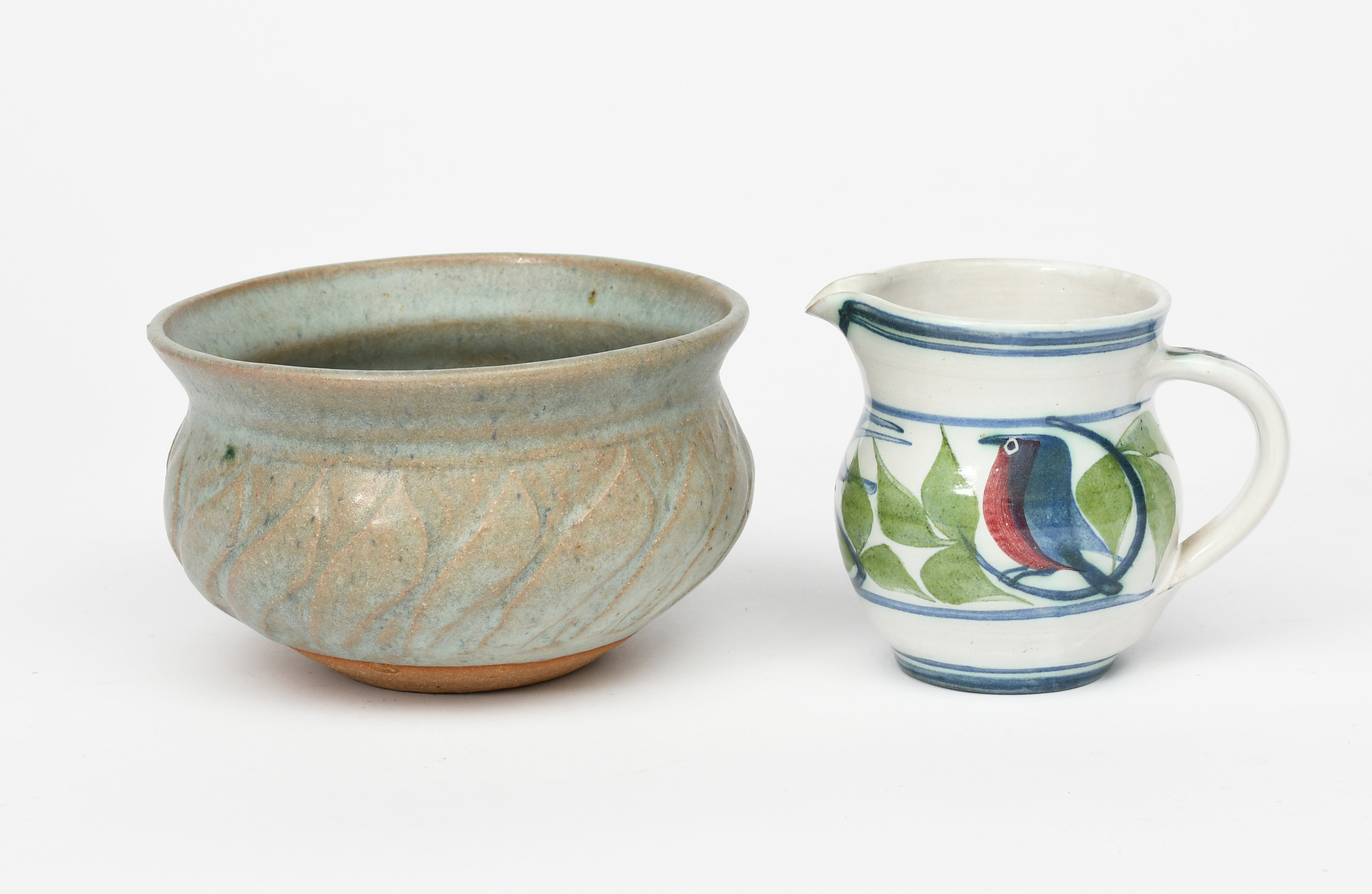 a stoneware bowl with cut decoration, covered to the foot with an ash glaze, a small tin-glazed jug by Laurence McGowan, and a pottery dish in the manner of Ewen Henderson,