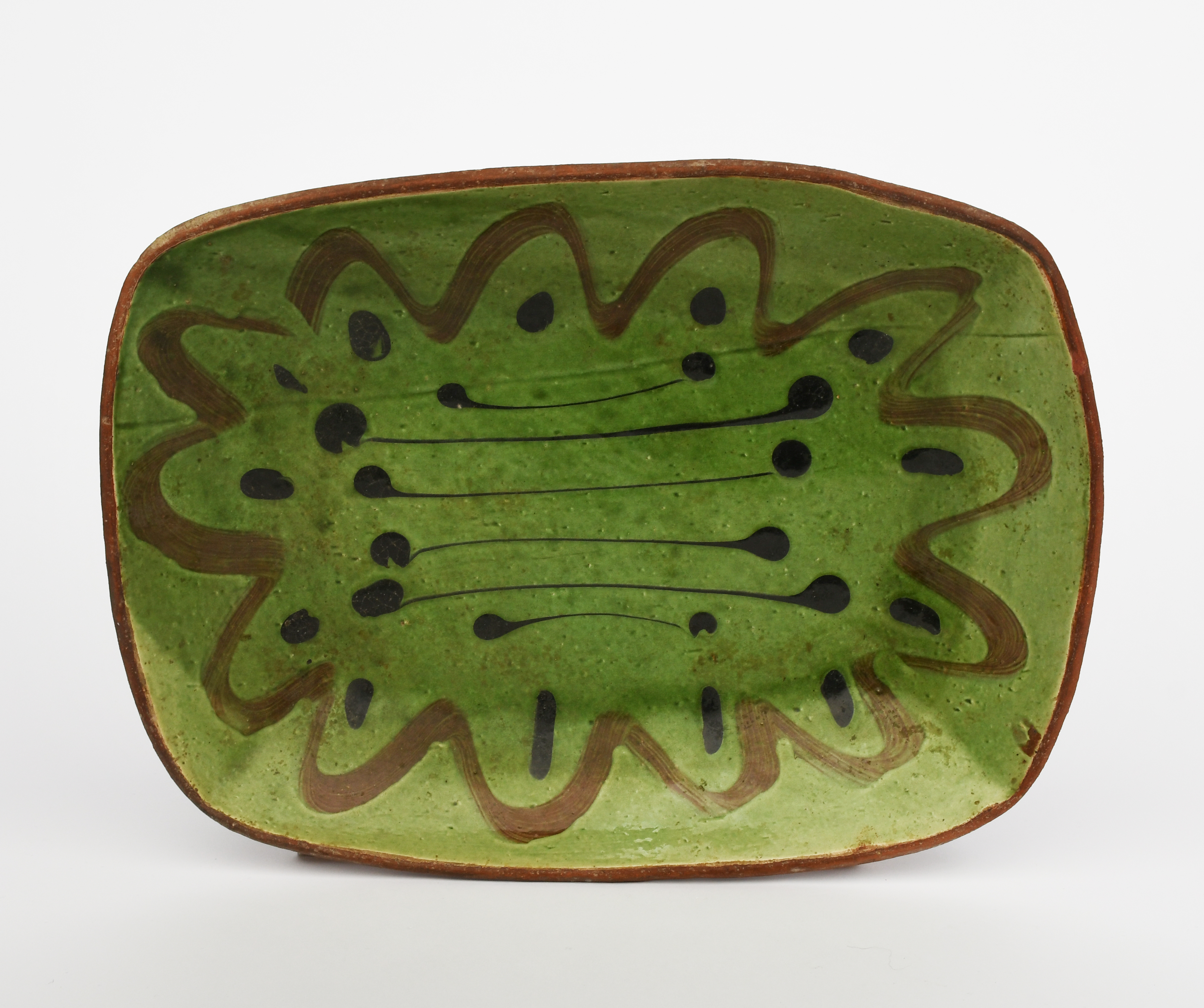 a slip-trailed dish, in ochre and brown on a green ground,