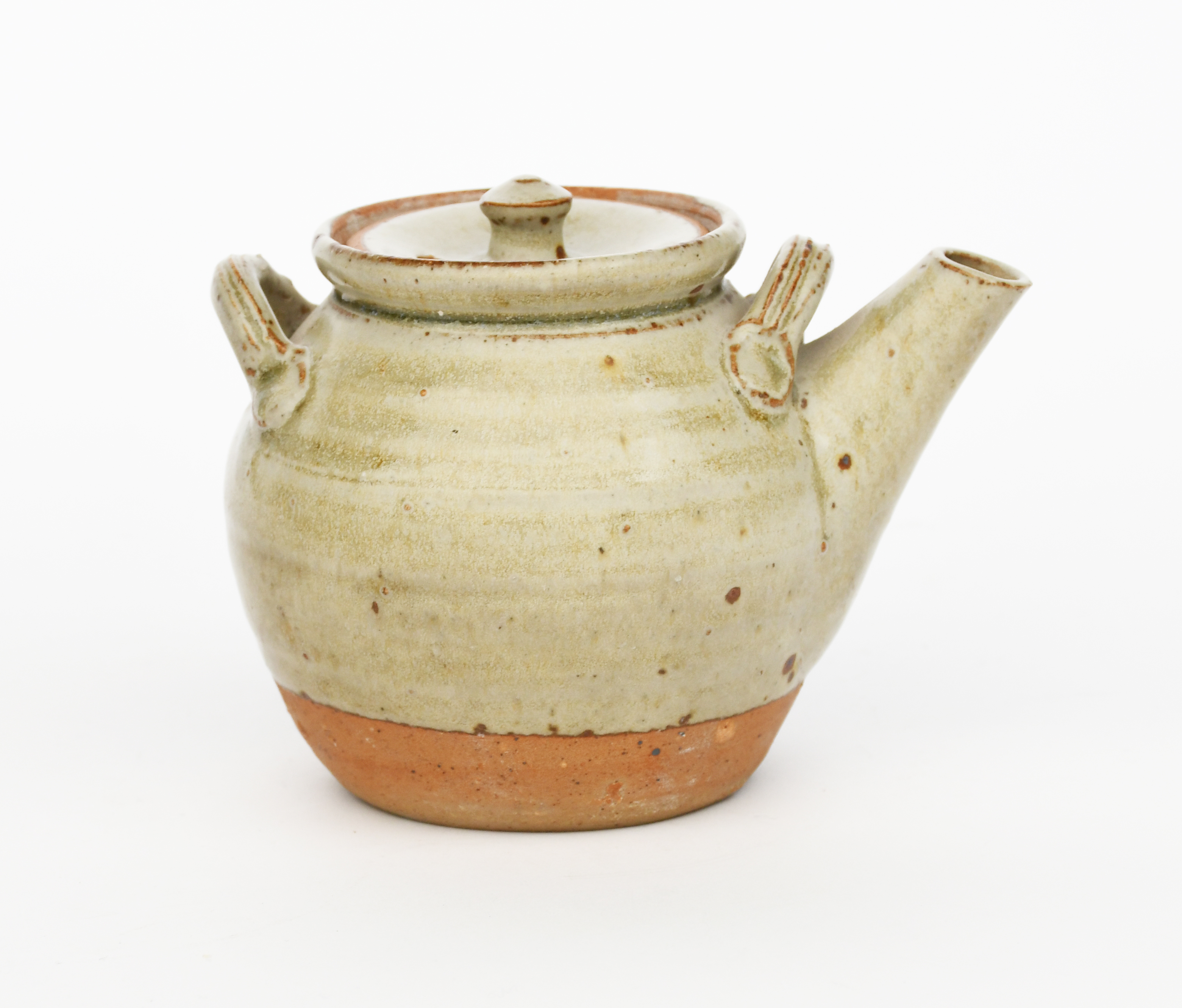 a small stoneware Japanese teapot and cover, with over slung handle lugs, covered in an ash glaze,