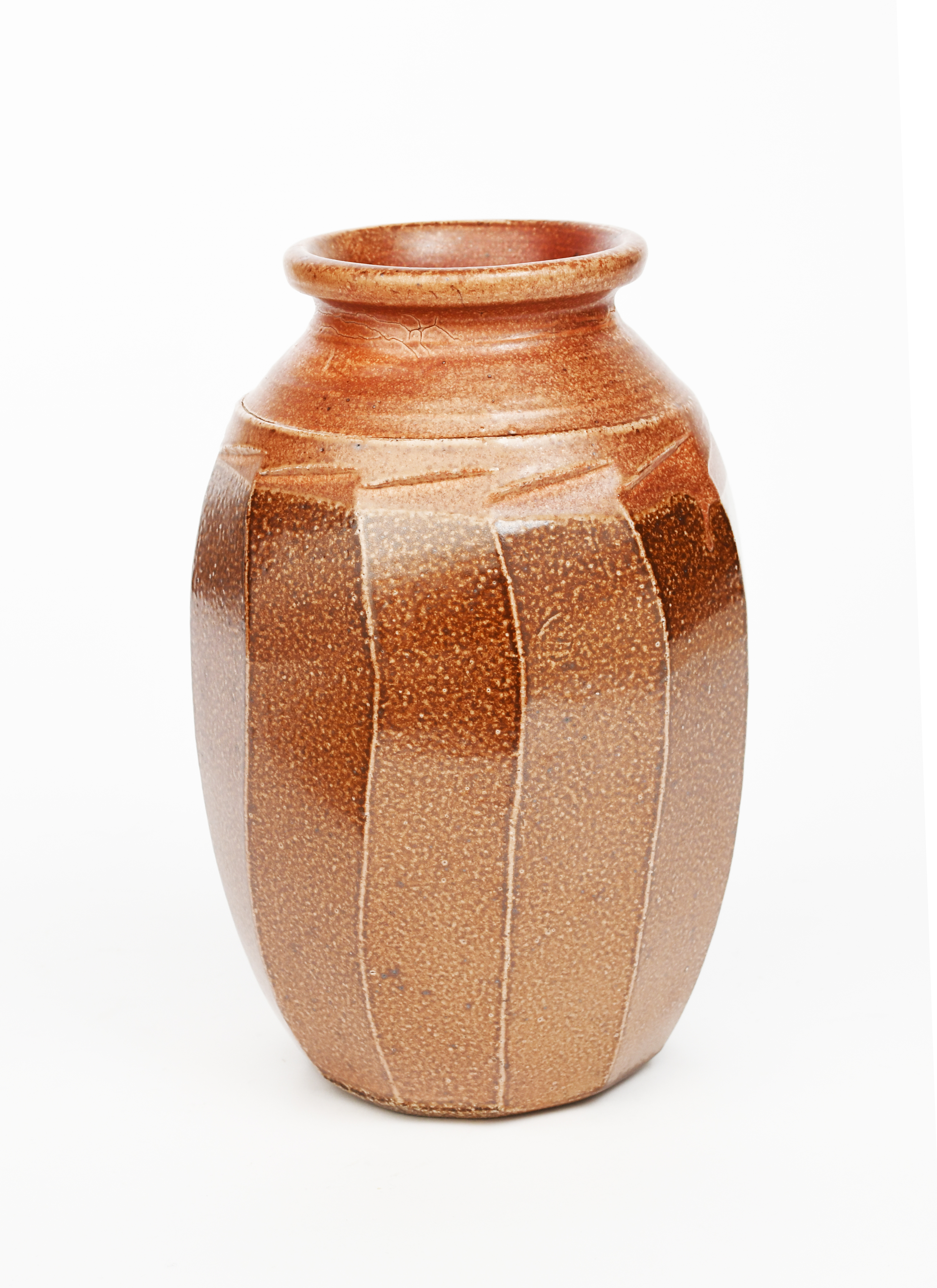 a salt-glazed cut-sided stoneware Lily jar, covered in a rust coloured glaze,