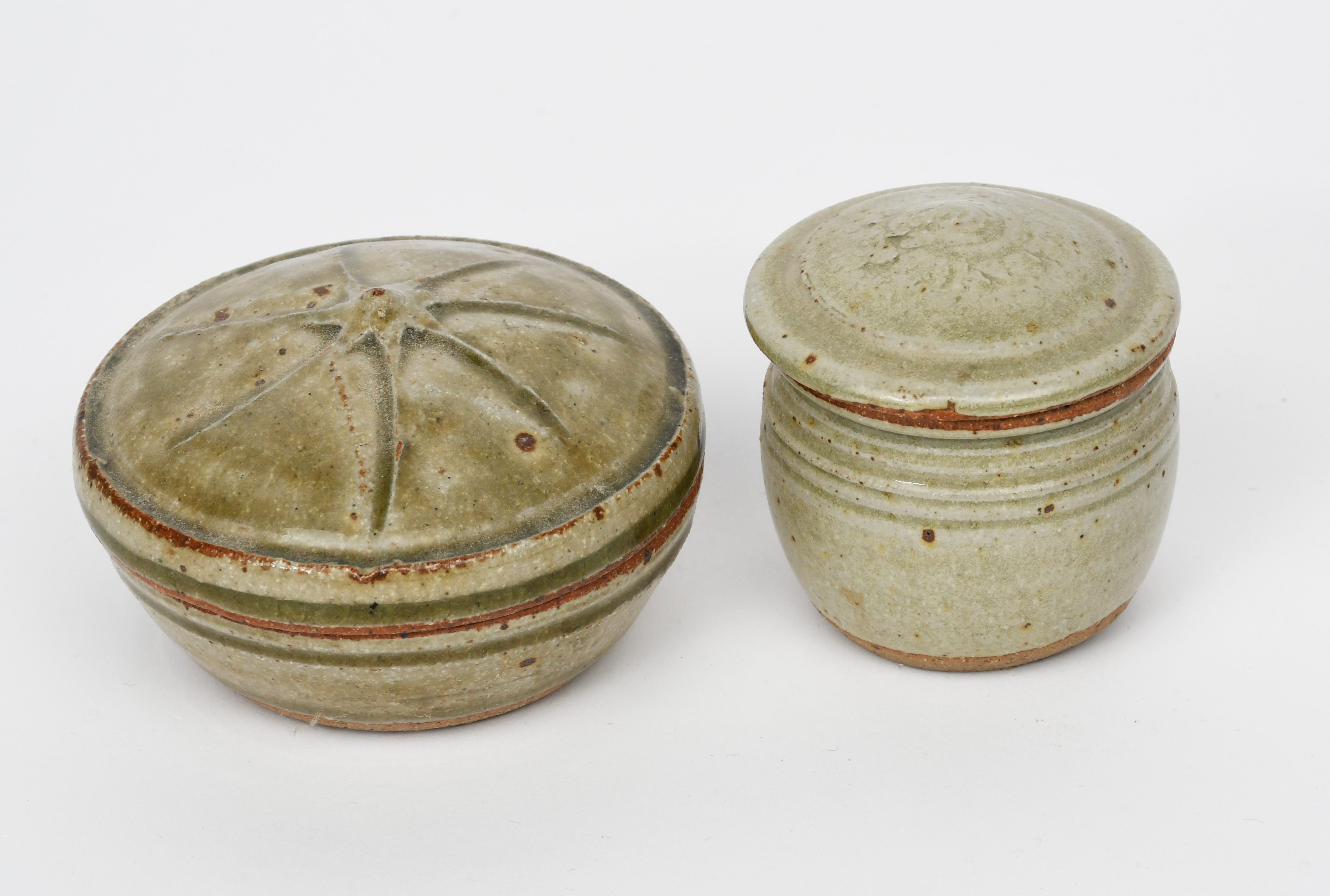 a small stoneware box and cover with star top, covered in an ash glaze, and a small stoneware mustard pot and cover with bands, covered in an ash glaze