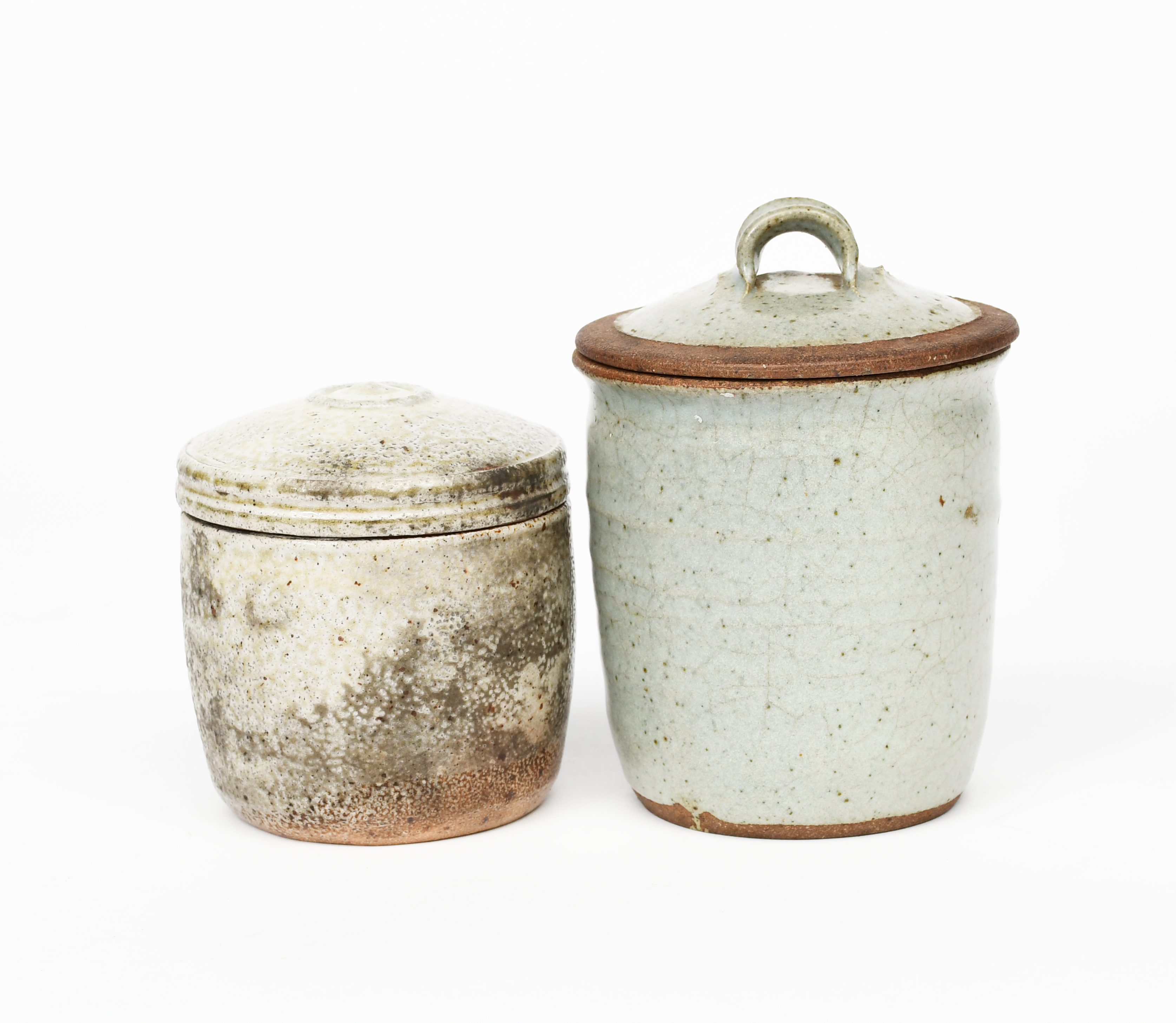a salt-glazed stoneware caddy and cover, and a stoneware sugar cannister and cover covered to the foot with a blue ash glaze,