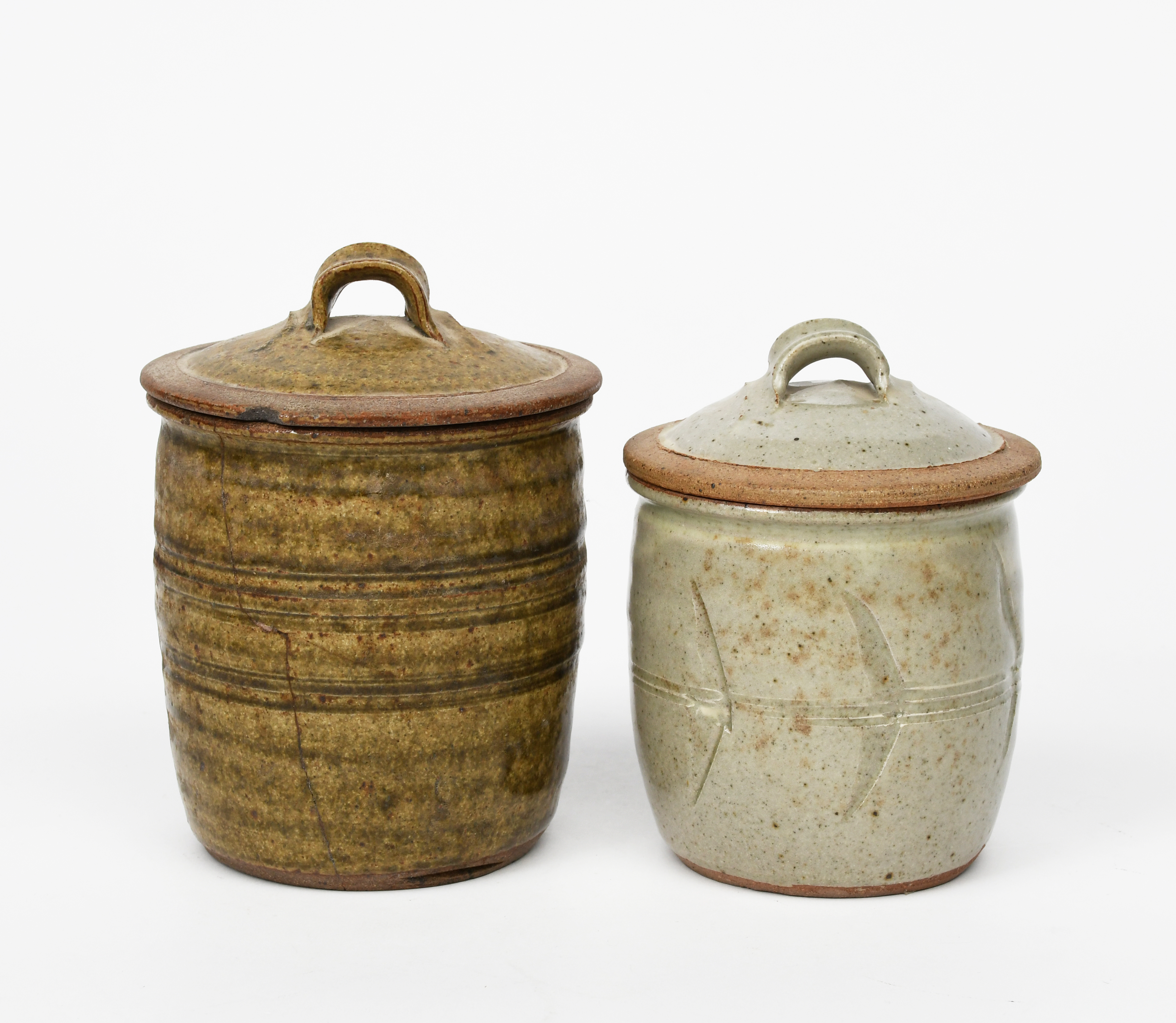 a stoneware sugar jar and cover, with incised chevron design, covered in a pale celadon speckled ash glaze, and another large sugar jar and cover covered in an ash glaze by Richard Batterham,