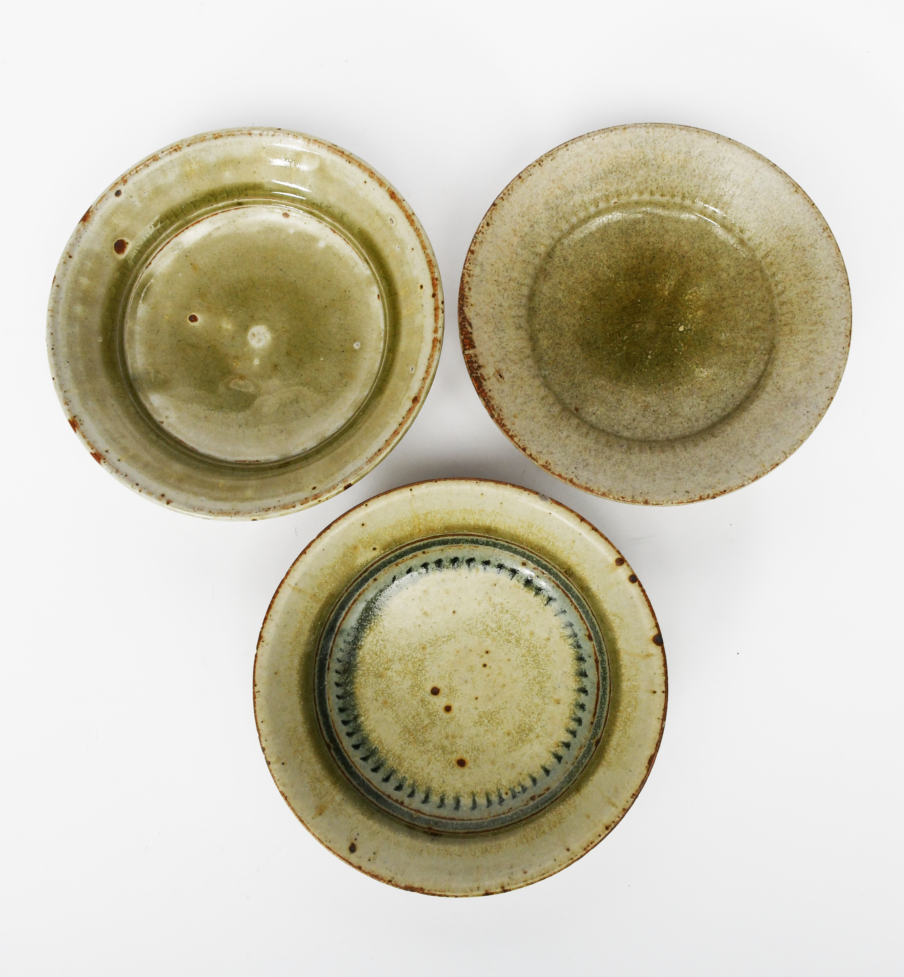 a stoneware plate with chatter band, covered in an ash glaze with cobalt, and two others similar,