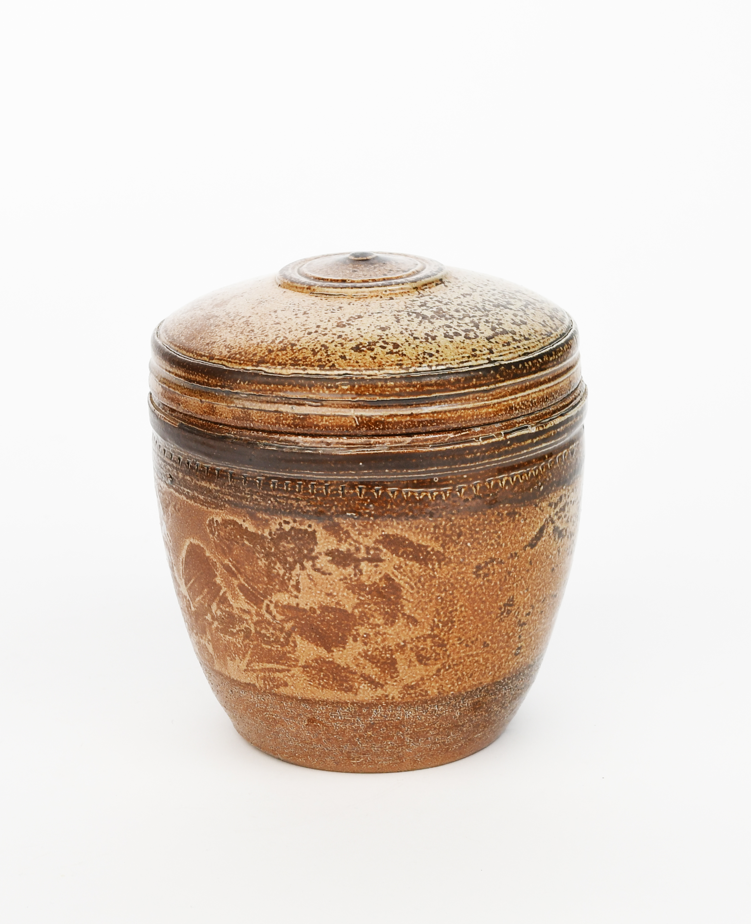 a salt-glazed stoneware large caddy and cover with chatter band, tan coloured