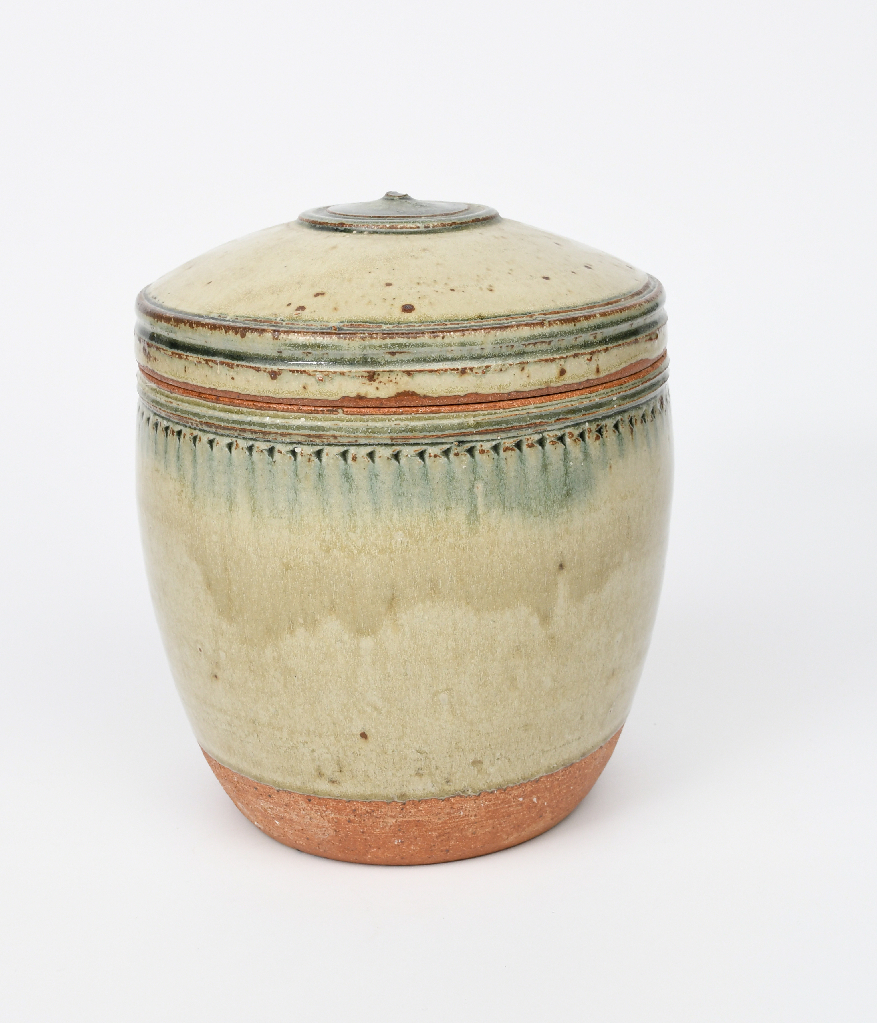 a large stoneware caddy and cover with chatter band, covered in an ash glaze