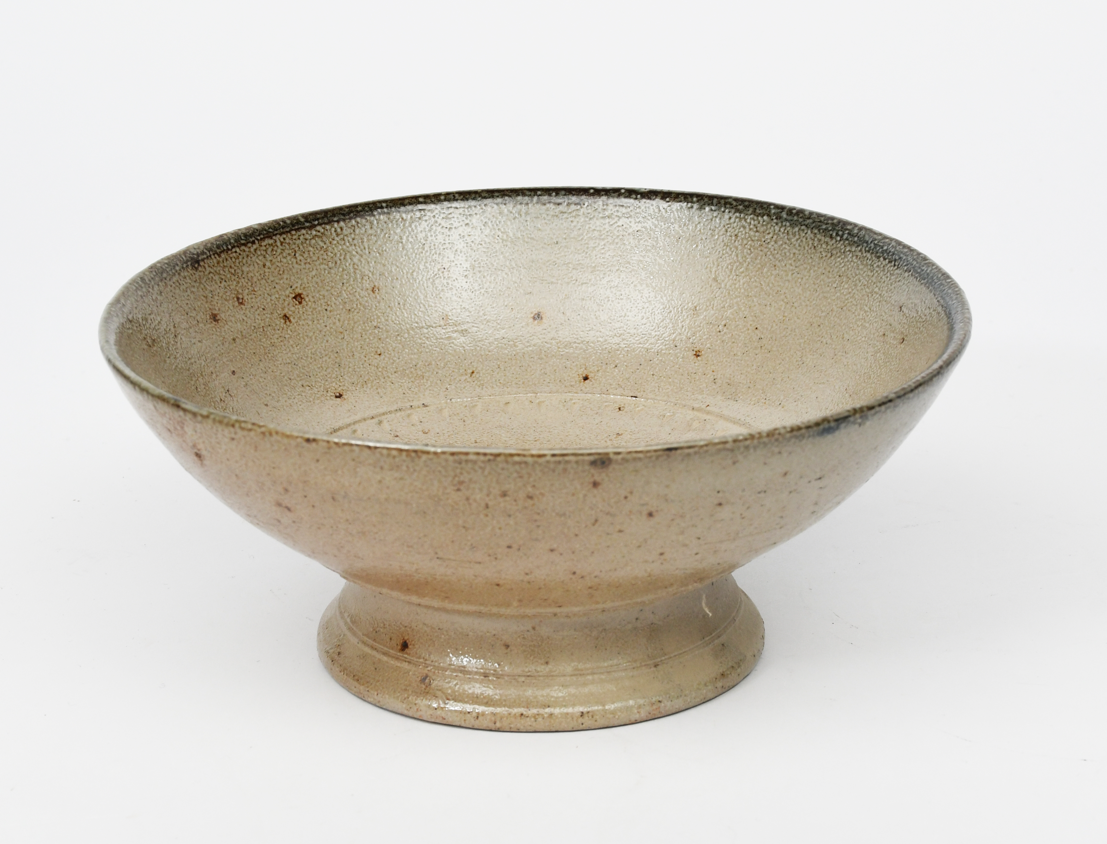 a salt-glazed stoneware tazza, with chatter band to interior and cobalt to the rim,