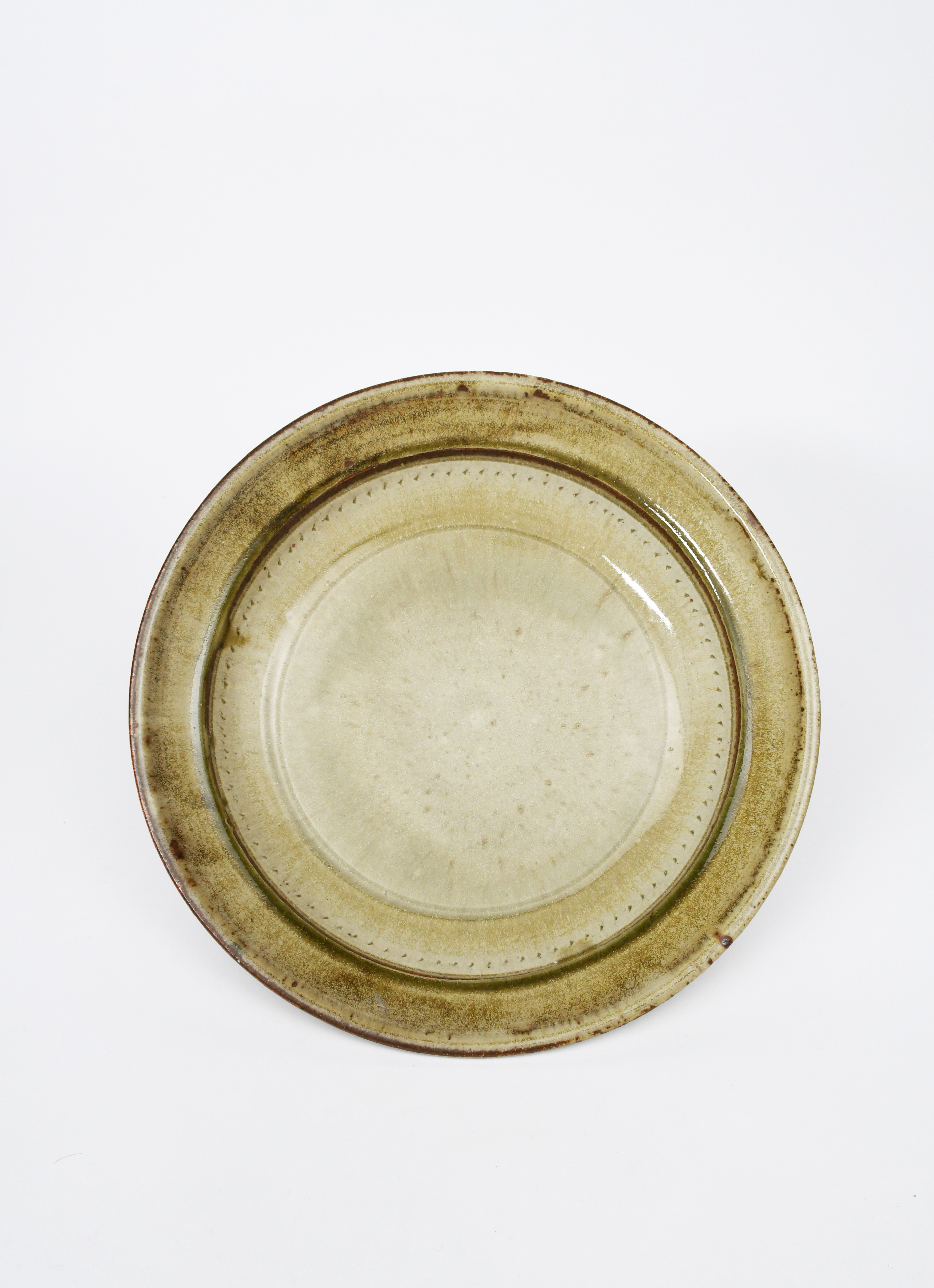 a large stoneware dish with chatter band, covered in an ash glaze