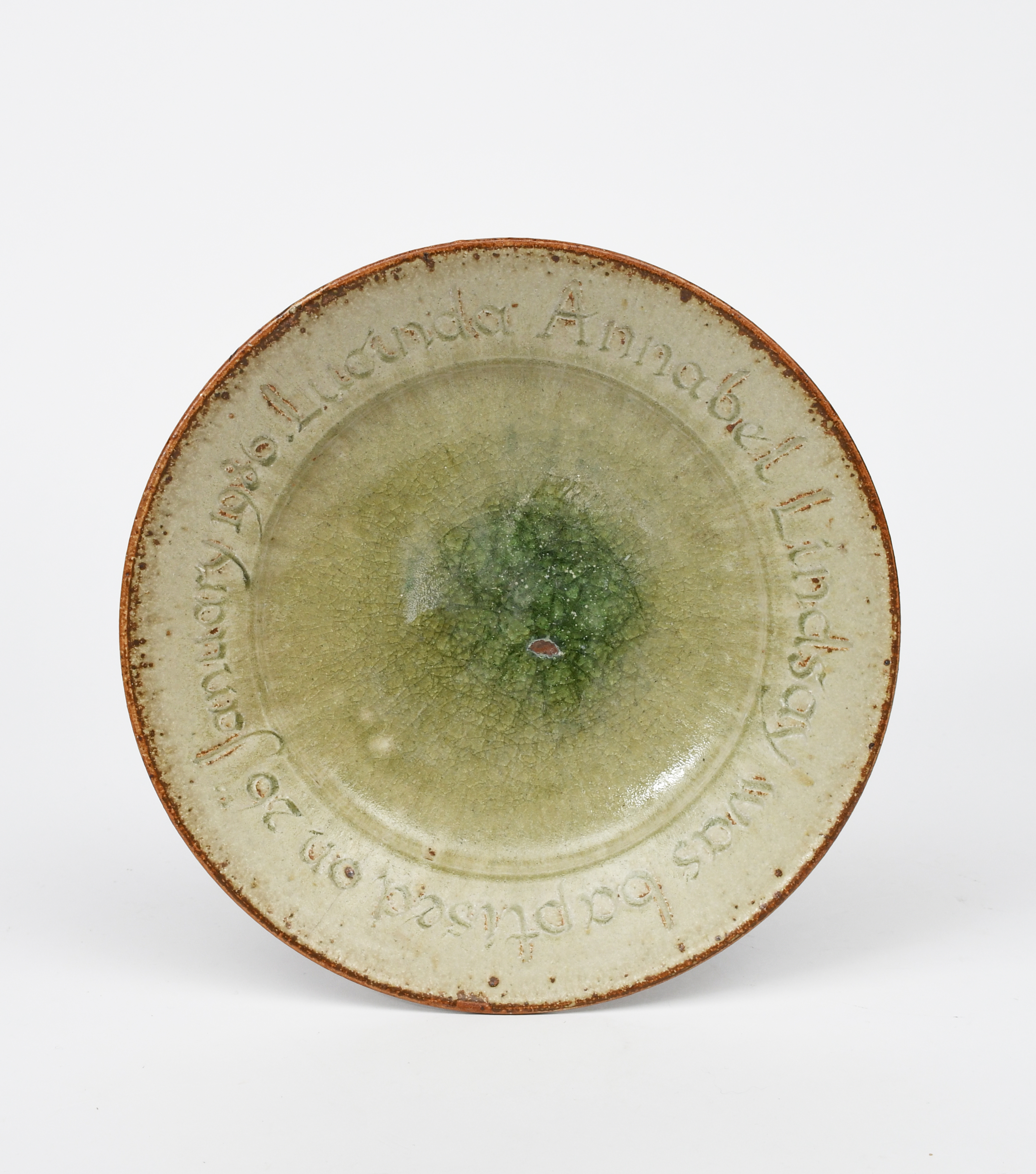 a rare stoneware commemorative plate, inscribed to the rim Lucinda Annabel Lindsay was baptised on 20th January 1986, under an ash glaze