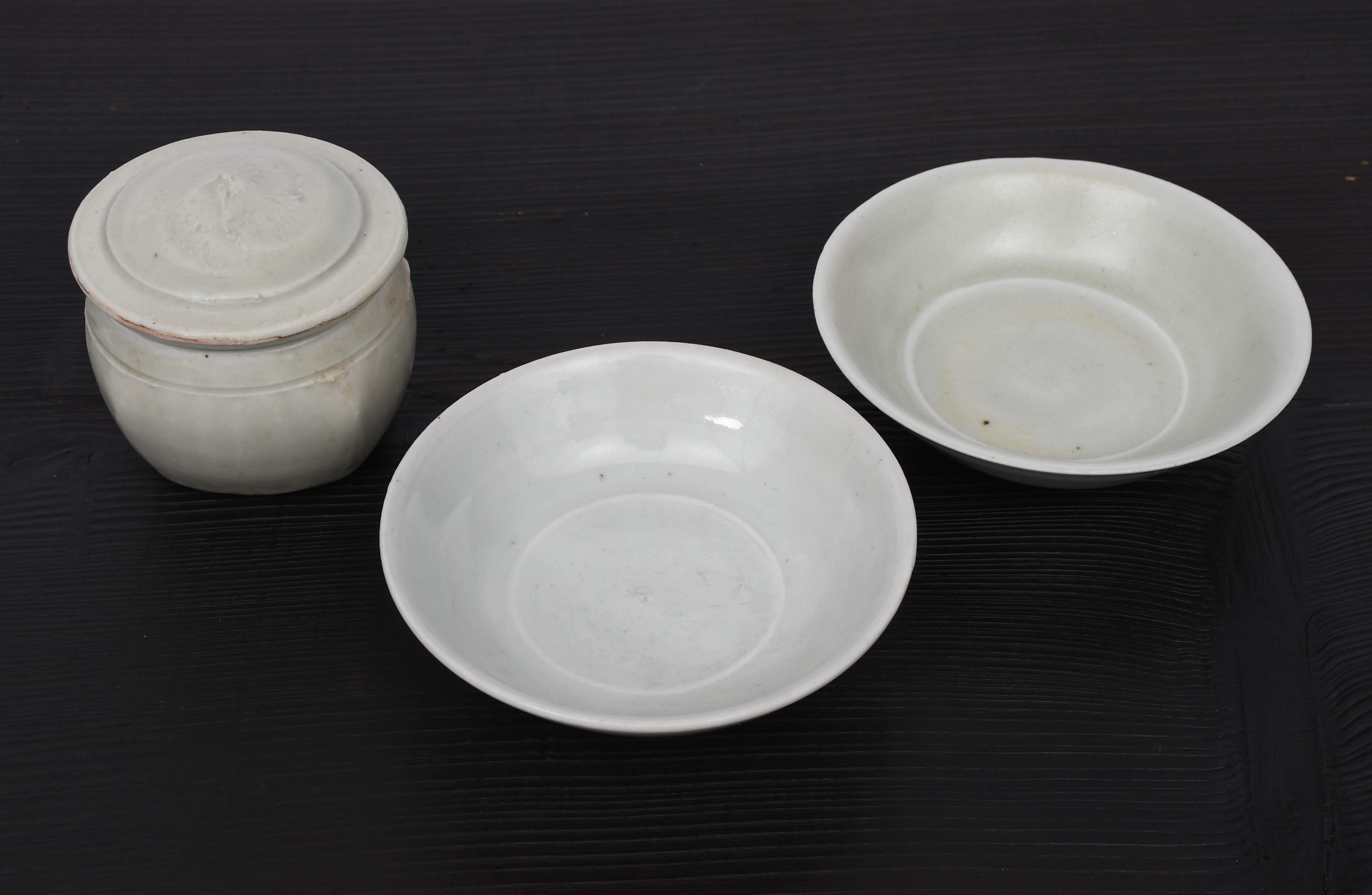a small porcelain beaten sided jar and cover, covered in a celadon coloured ash glaze, and two porcelain avocado dishes,