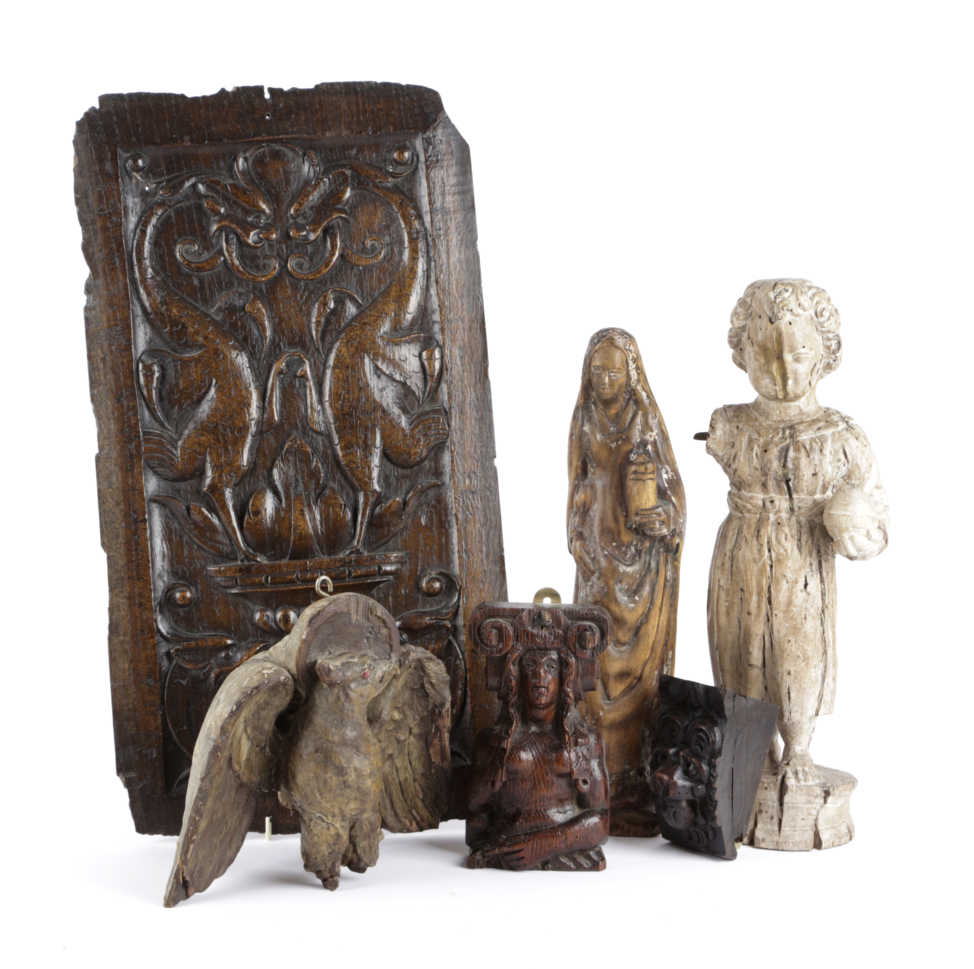 the emblem of St John the Evangelist, together with a 16th century oak panel carved with a pair of fantastical birds amongst foliage, a carved figure of a child holding an orb, two oak appliques and a figure of a lady (6)