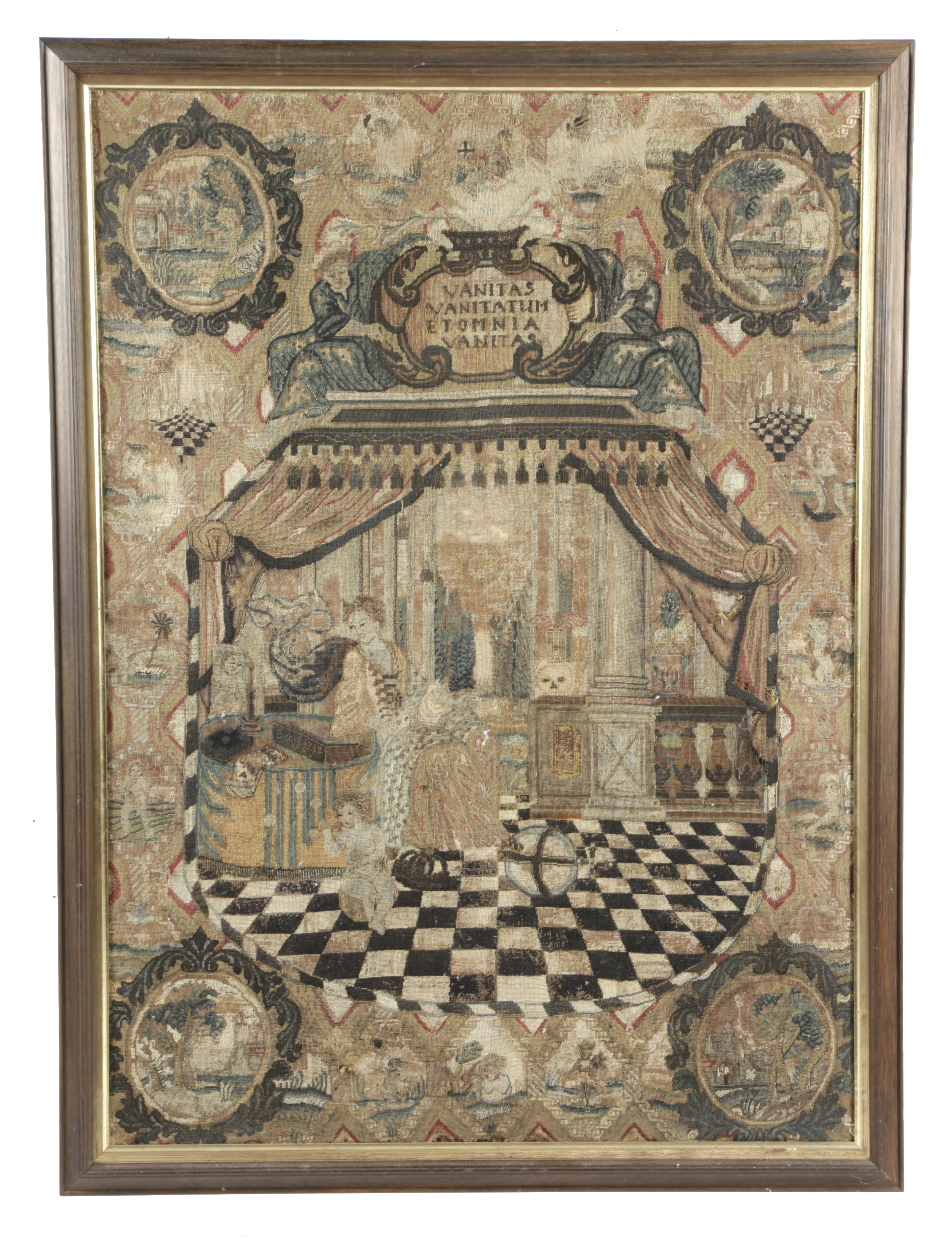 centred by a seated queen, probably Queen Anne, an orb and crown at her feet, below a swagged fabric canopy, a chequered floor to the foreground and beneath the inscription 'Vanitas vanitatum et omnia vanitas’, (in vanity of vanities, all (is) vanity : earthly life is ultimately empty), an oval vignette to each corner depicting a rural scene, with a ground of lozenge shaped depictions of cherubs, modern unglazed frame