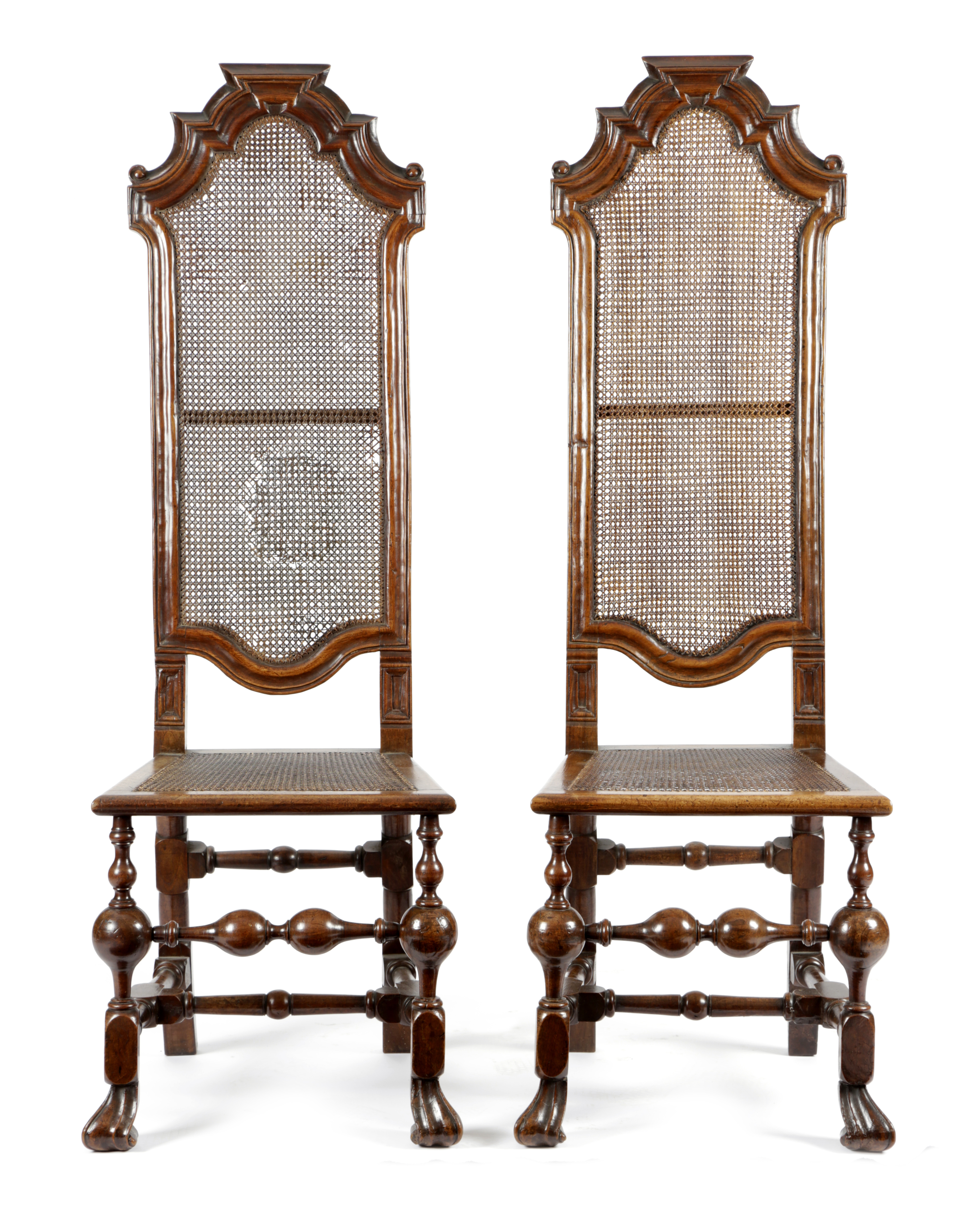 each with a caned back and seat with a moulded frame, on ball and baluster turned front legs united by a conforming stretcher and on Braganza feet (2)