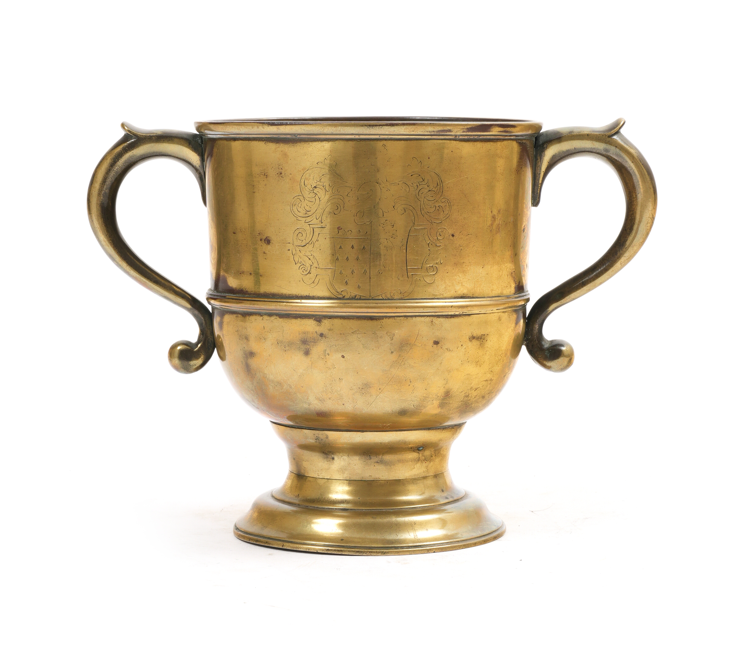 Mid-18th century loving cups in brass are rarer than their silver counterparts. For similar examples one with a cover and another with traces of silvering, see R. Gentle & R. Field, 'Domestic Metalwork 1640-1820', pp.278-9, figs. 1-3.