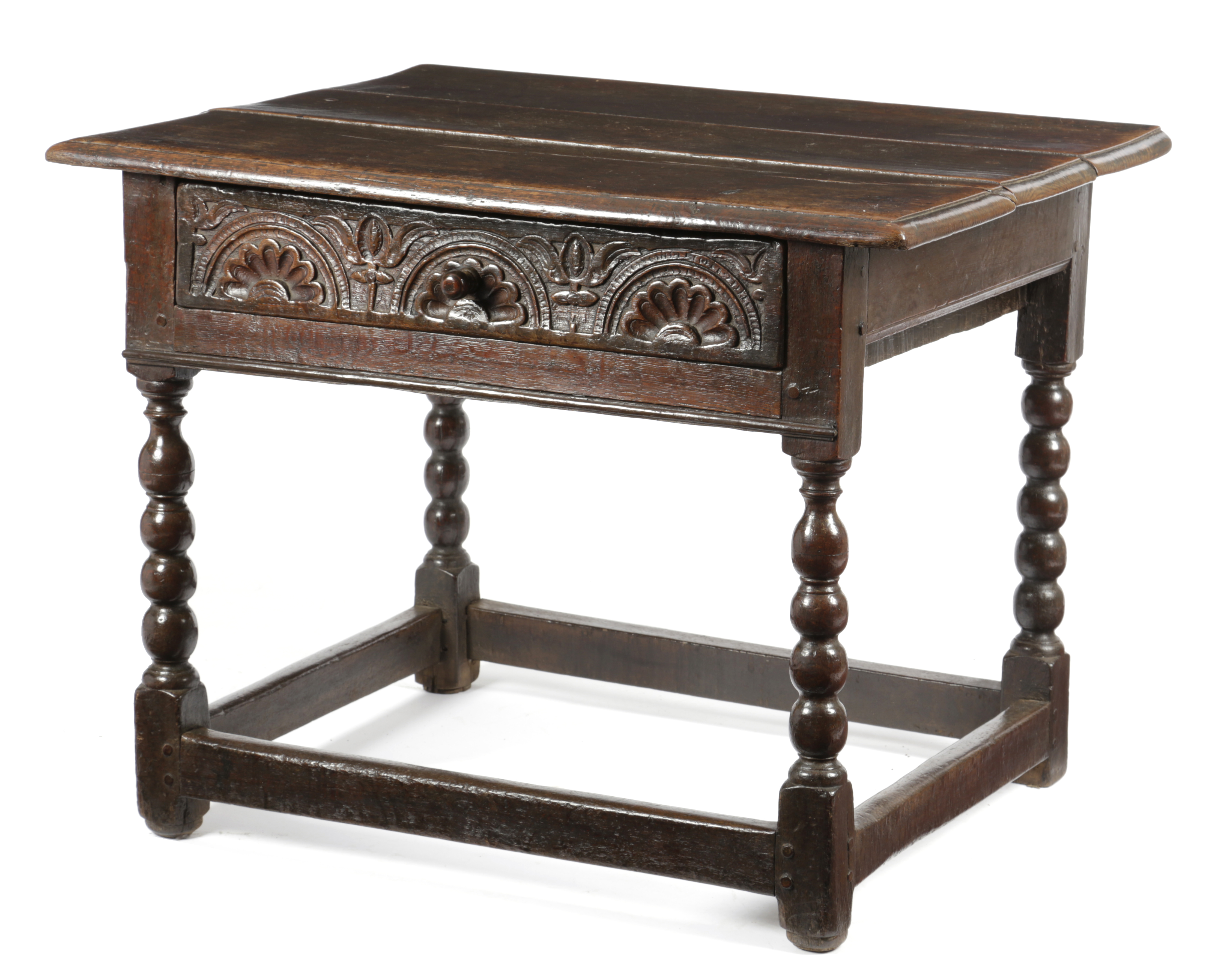 the triple plank top with a moulded edge above a frieze drawer carved with lunettes interspersed with flowers on bobbin turned legs united by peripheral stretchers