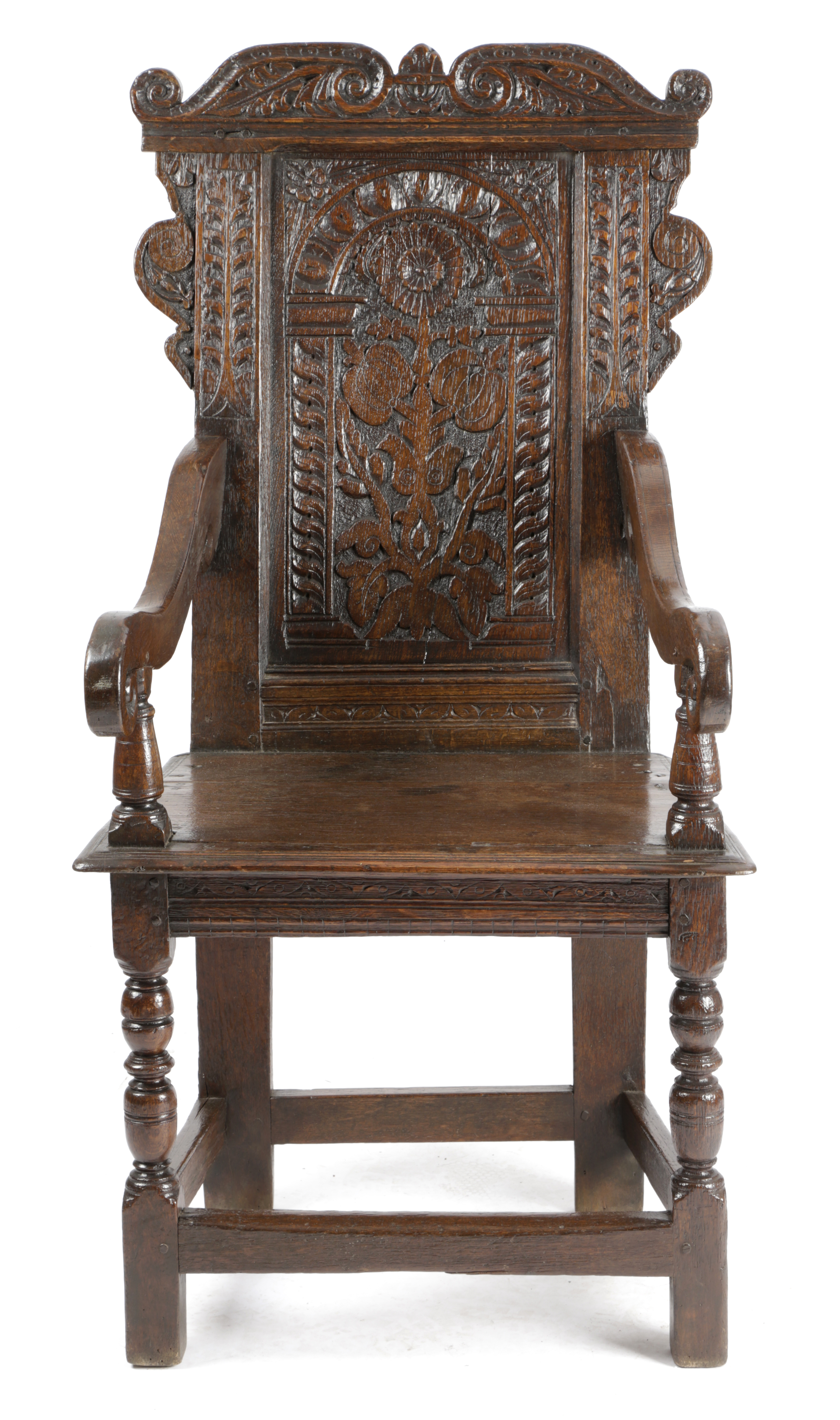 A CHARLES I OAK PANELLED BACK ARMCHAIR