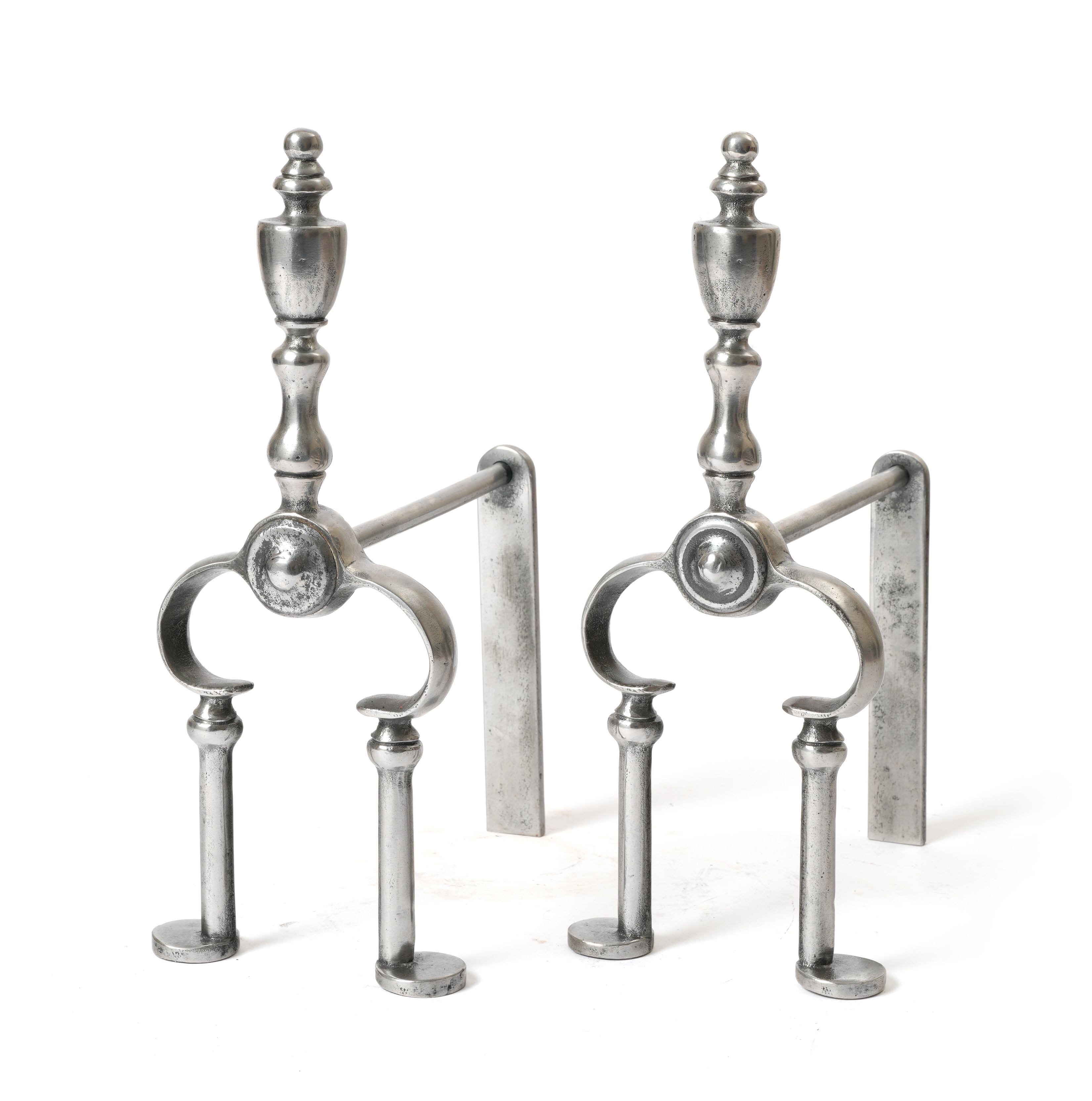 A PAIR OF POLISHED STEEL ANDIRONS