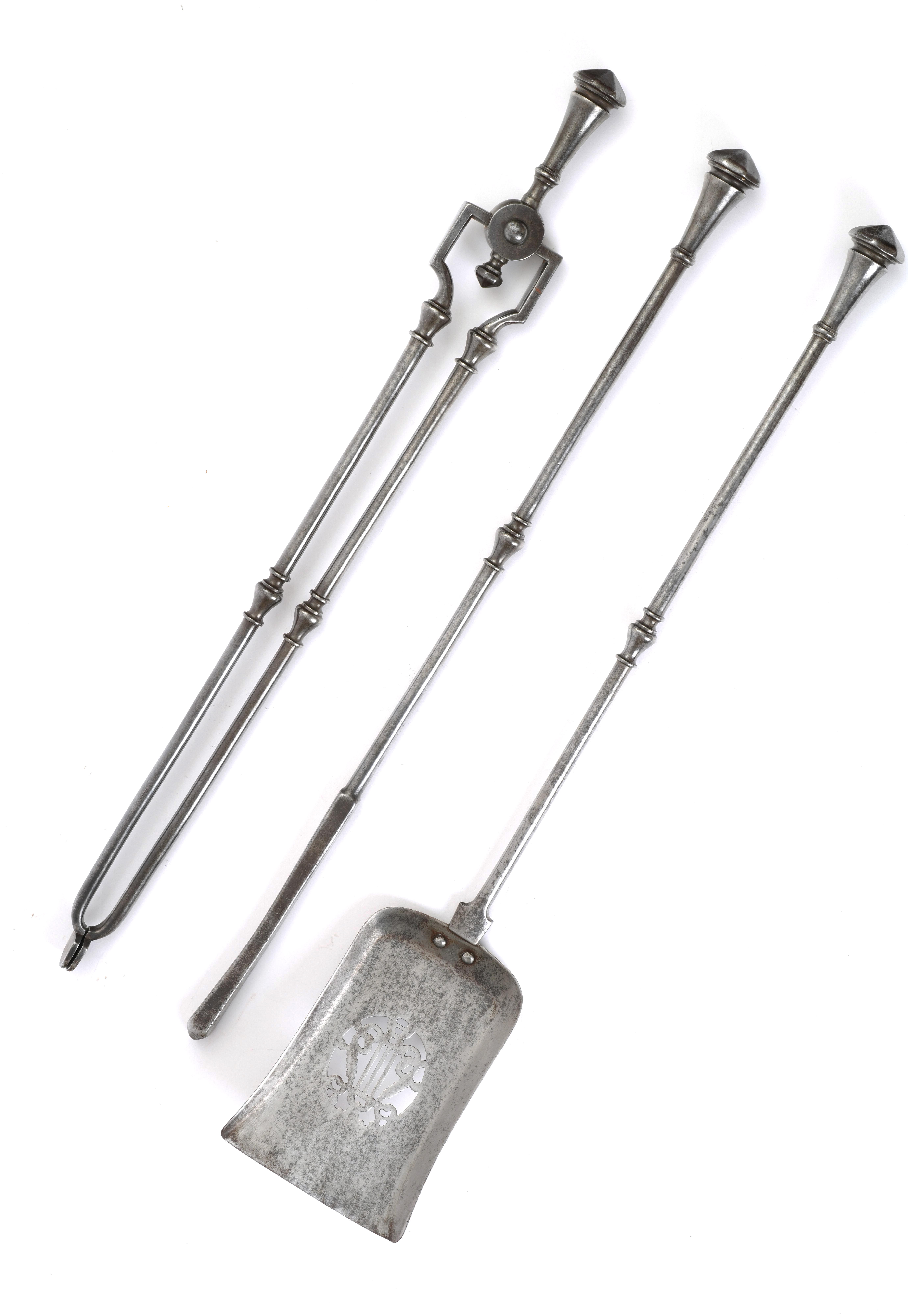 with faceted mushroom finials and baluster turned shafts, the shovel with a pierced blade (3)
