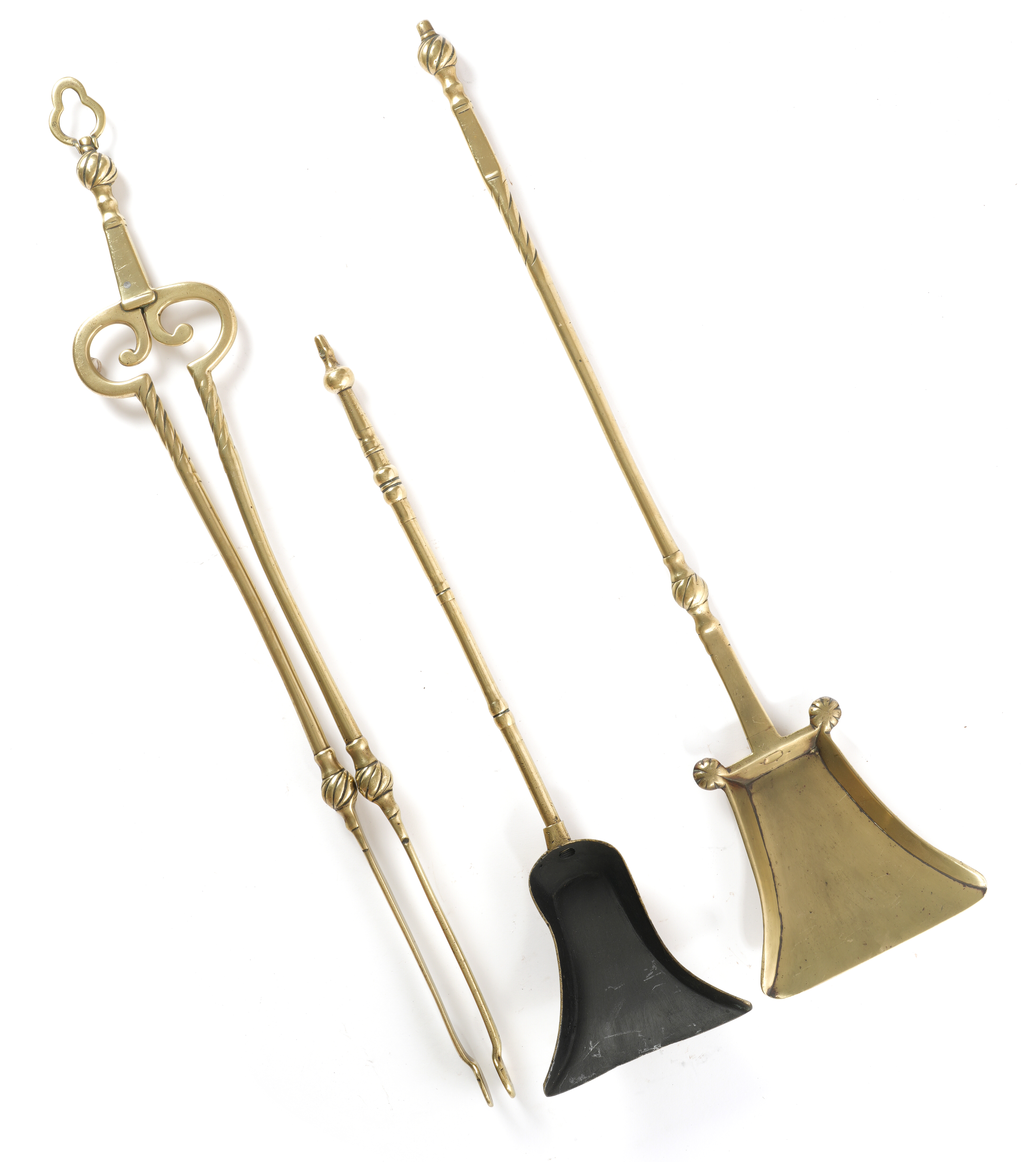 with twisting decoration to the shafts and finials, comprising: a shovel and pair of tongs, together with another shovel with turned decoration to the shaft (3)