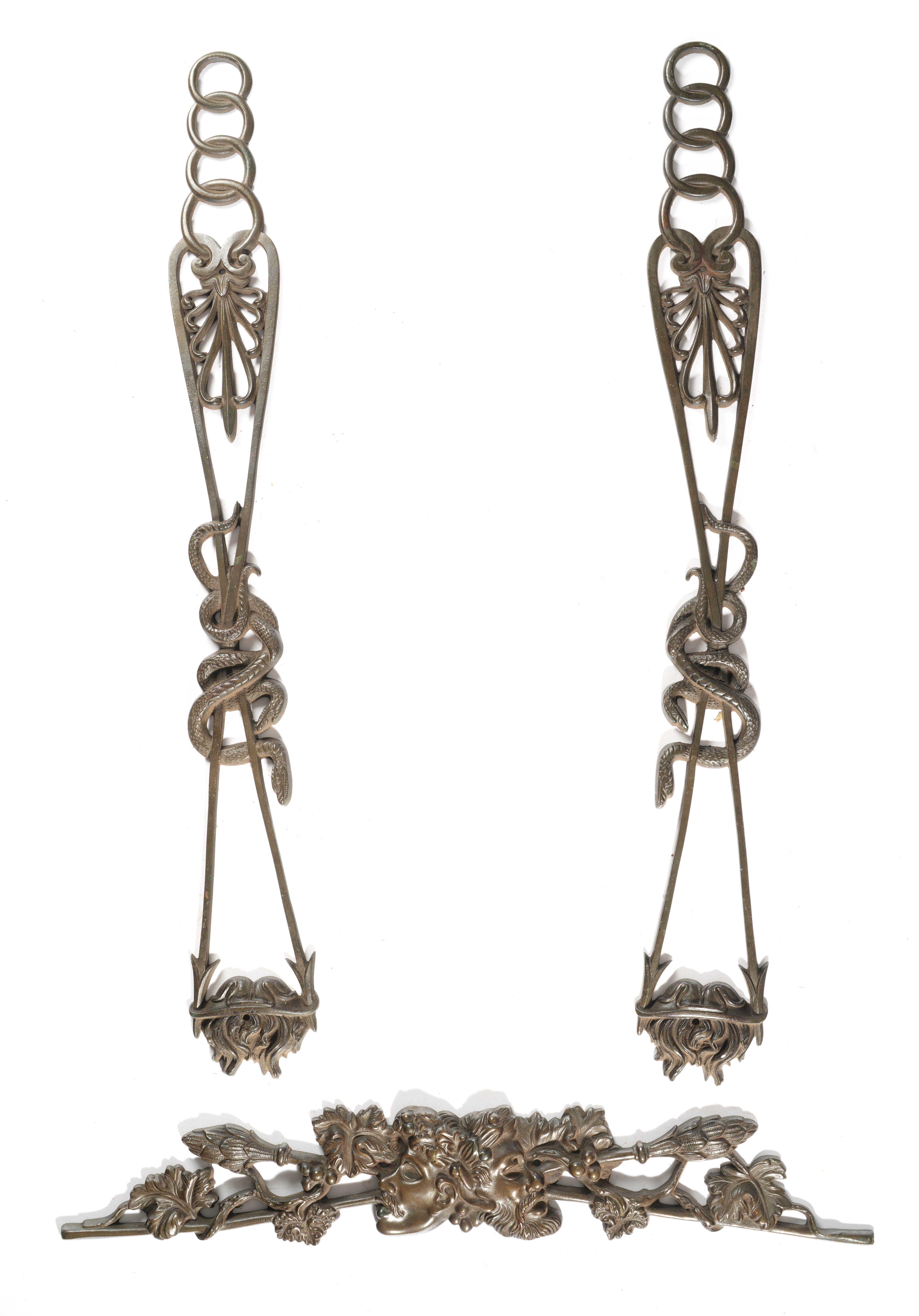 one in the form of a pair of bacchanalian masks, a grapevine and staffs, two modelled as a pair of arrows supporting flames above a serpent and an anthemion motif (3)