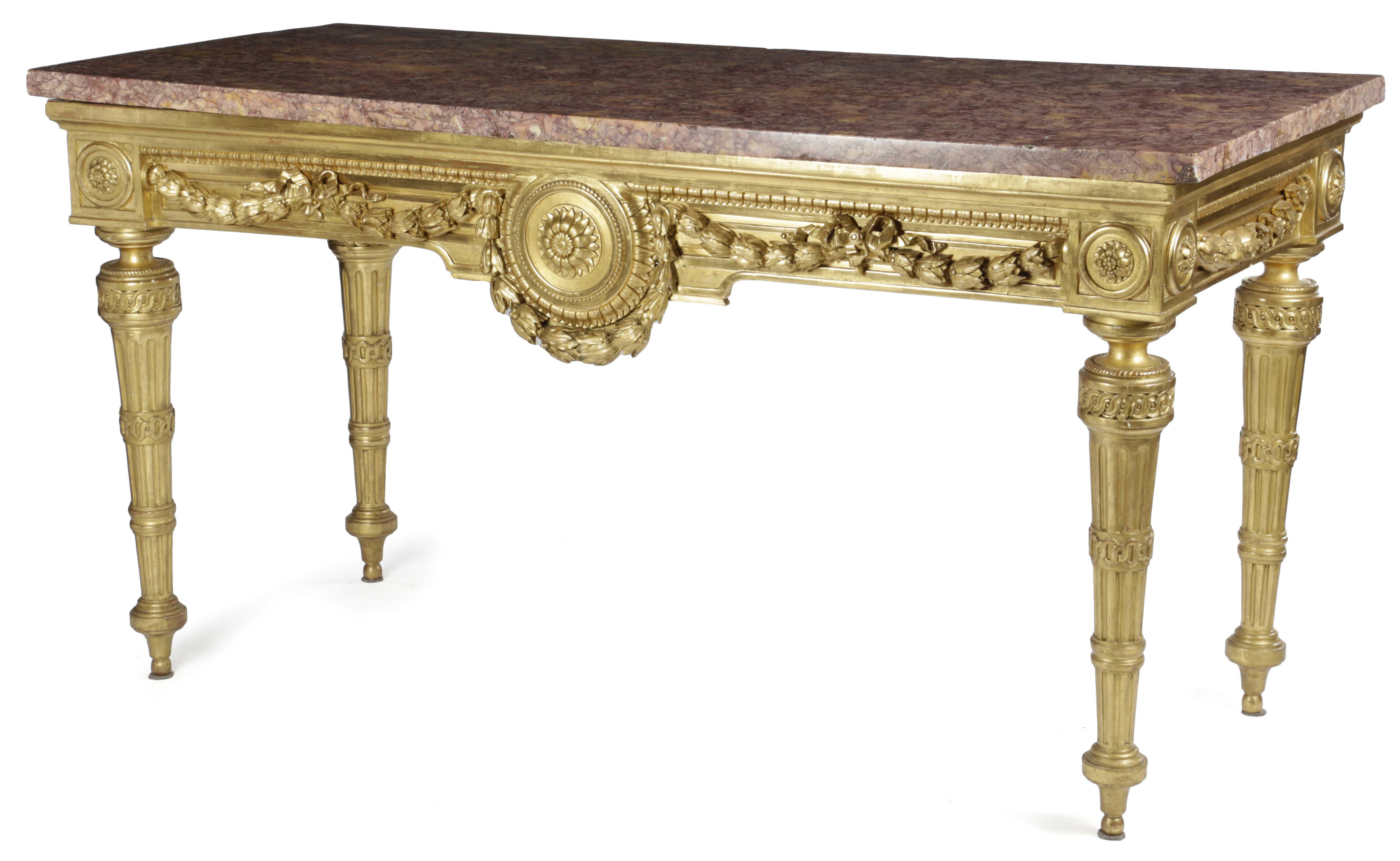 the Spanish brocatelle marble top above a frieze decorated with ribbon tied laurel swags and rosettes on fluted tapering legs inscribed in pencil twice 'M. de Champ 181'
