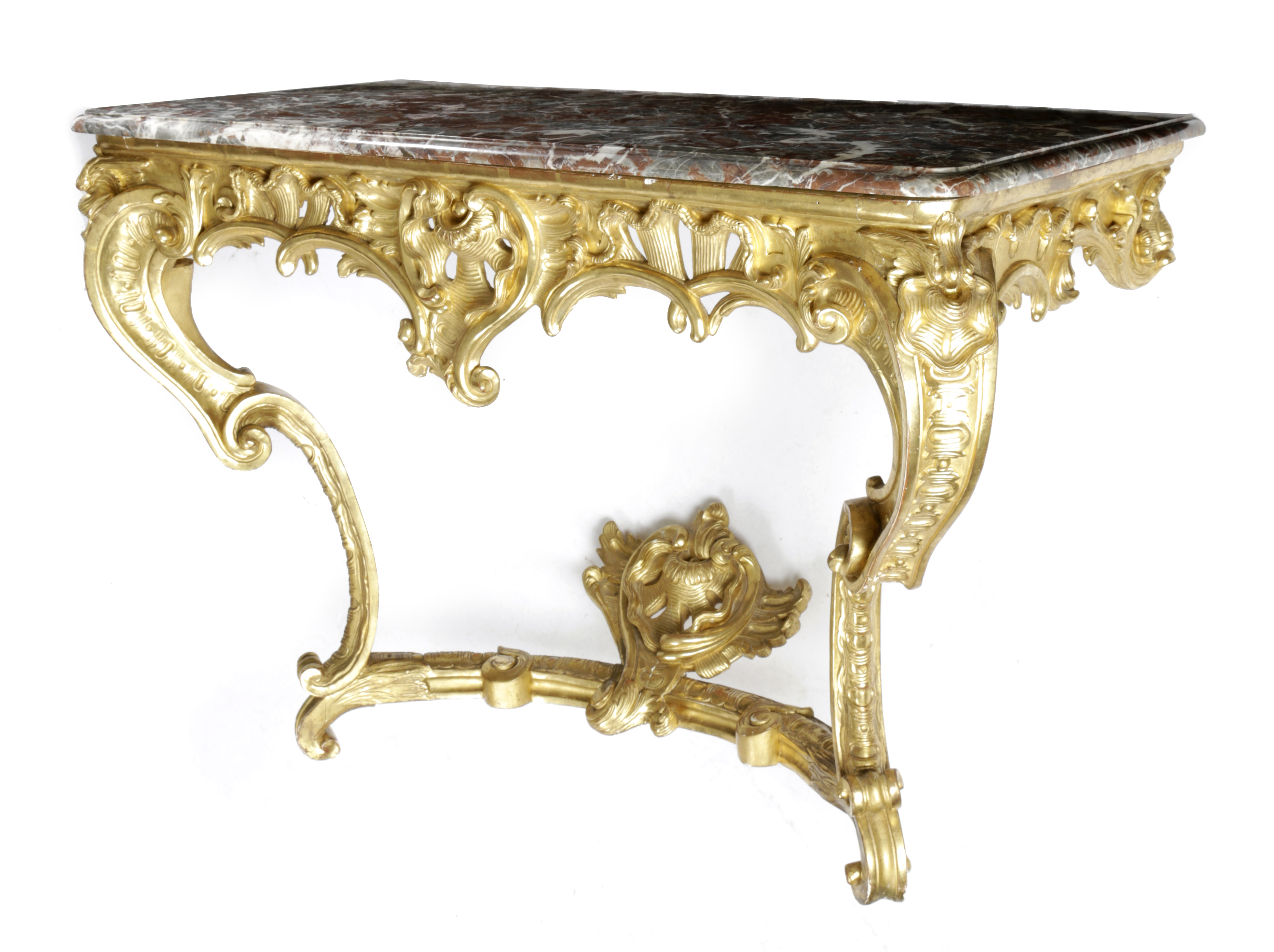 the rouge royale marble top with a moulded edge above a pierced frieze carved with rocaille on scroll legs united by a stretcher decorated with a cartouche