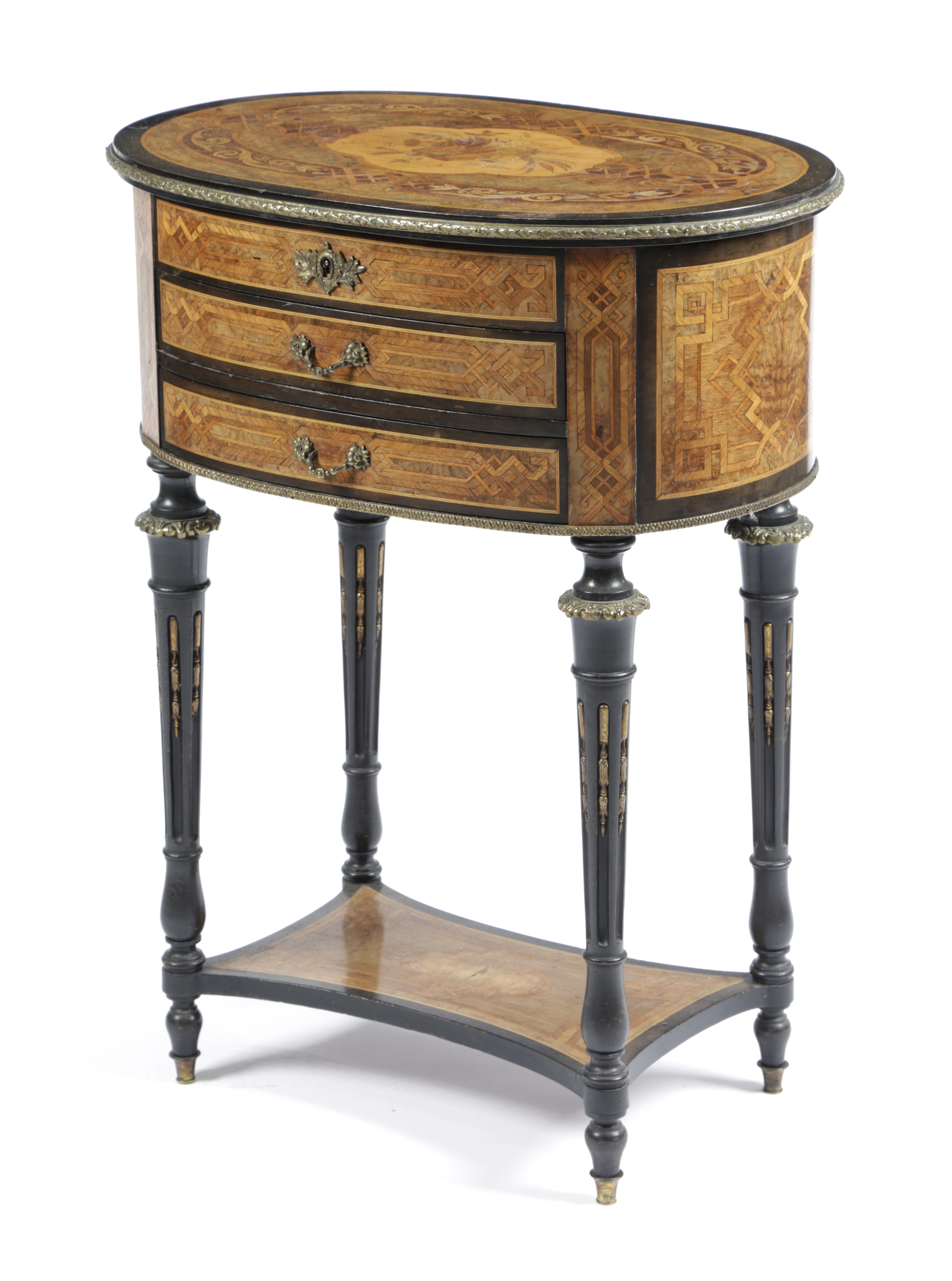A FRENCH WALNUT EBONISED AND MARQUETRY OVAL TABLE A OUVRAGE