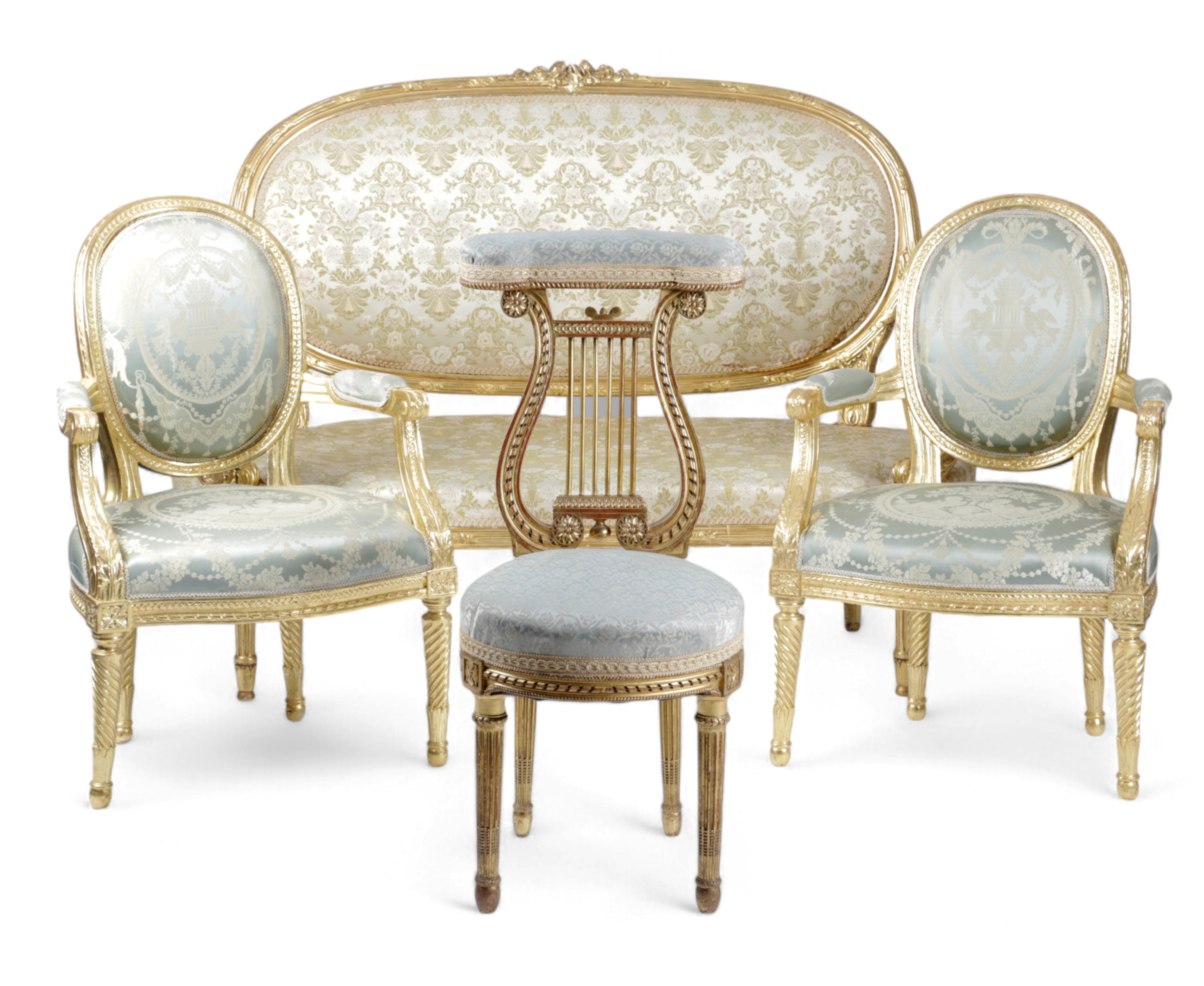 decorated with flowers, scrolls and leaves, together with a French giltwood music chair with a lyre shaped back and a pair of giltwood fauteuil (4)