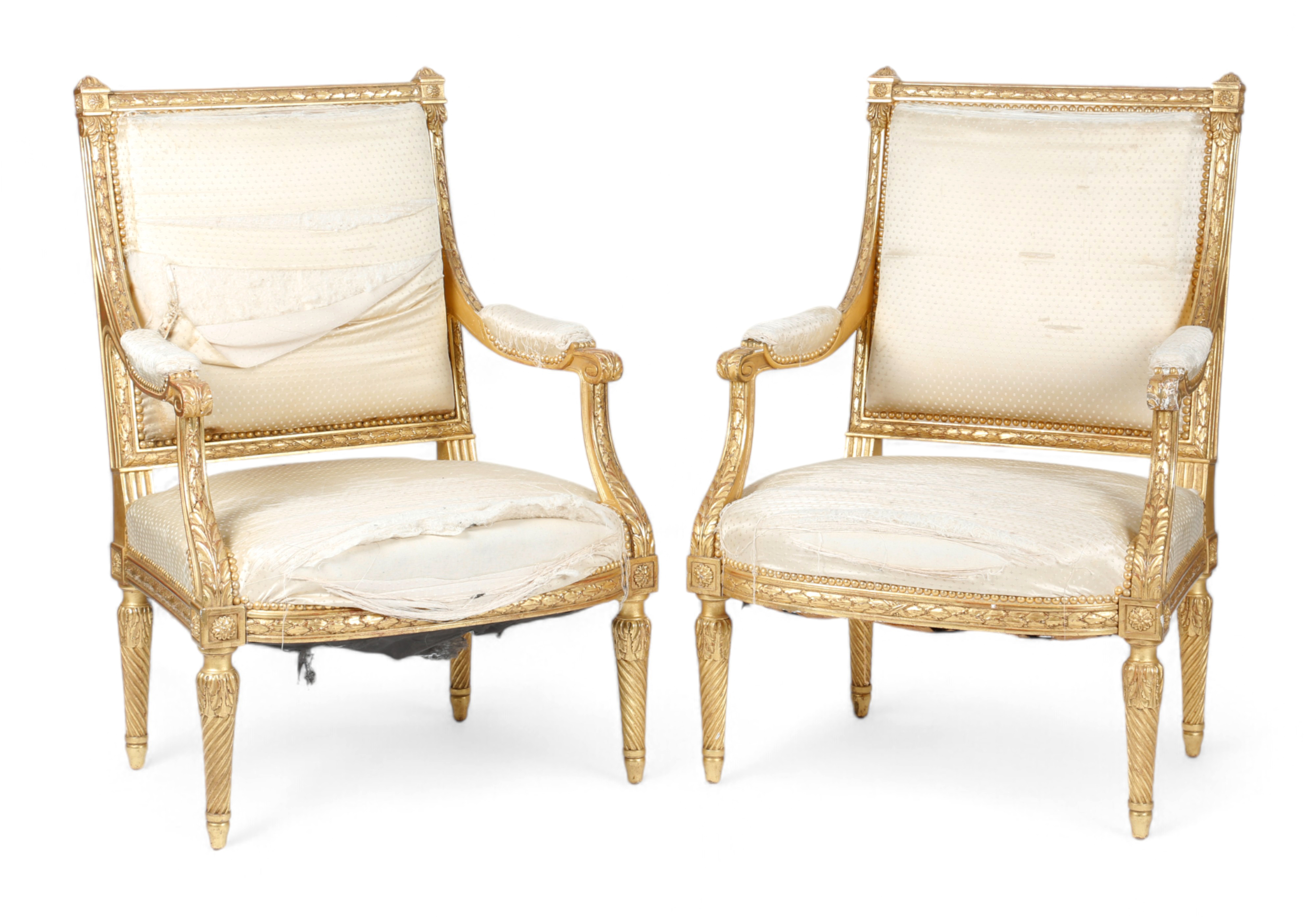 each with a padded back, seat and armrest covered in ivory silk, the frame decorated with laurel leaves, acanthus and paterae (2)