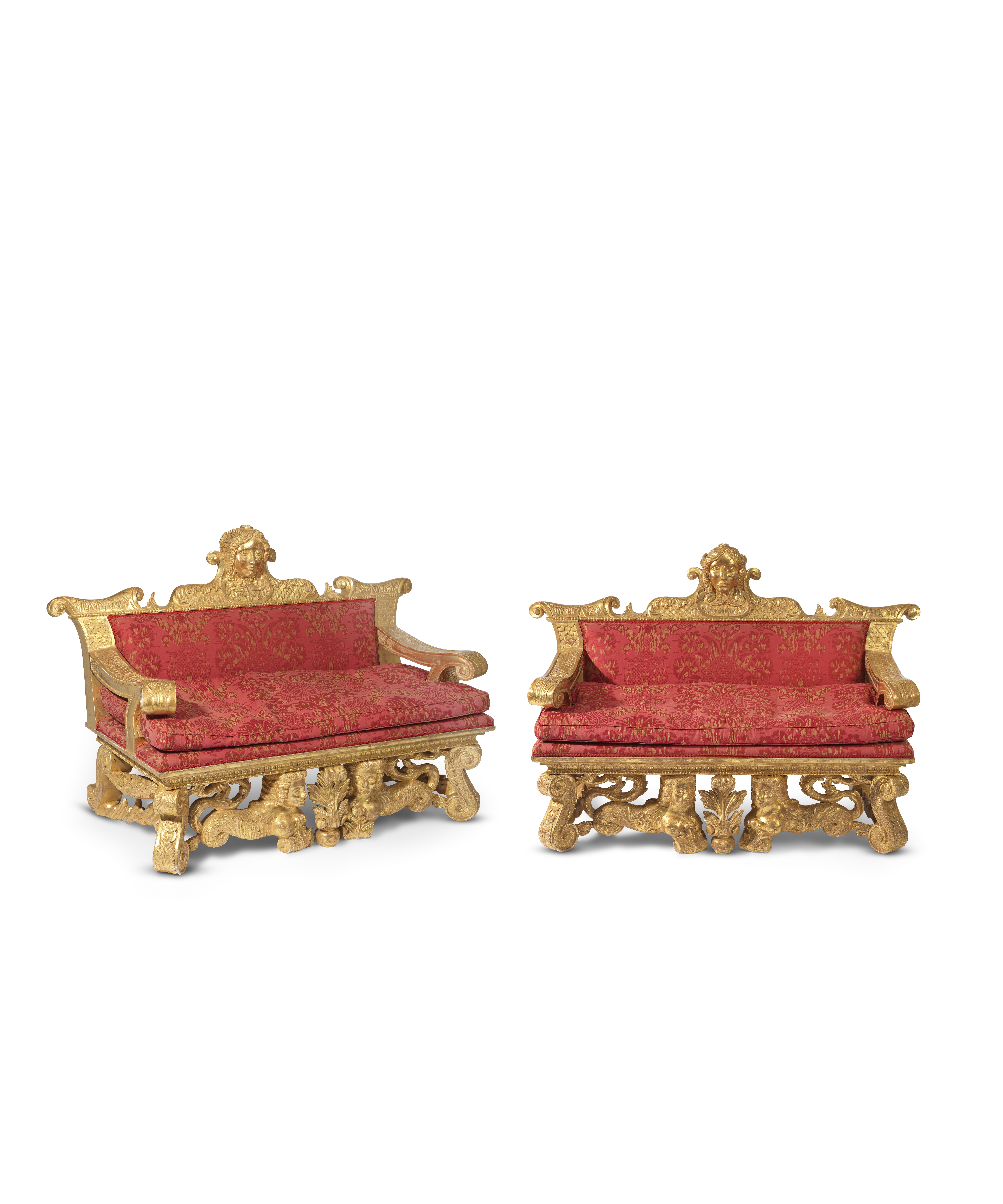 The original set of eight settees, of which this pair is a copy, were designed by William Kent for Richard Child, Viscount Castlemaine, between 1725 and 1730, to go into his newly completed Wanstead House in Essex. The contents of the house were sold in 1822, prior to the house being demolished in 1824. The catalogue described each settee as “an elegant square settee, in superb massive carved and gilt frame, with scrolled elbows, the back stuffed in costly crimson Genoa velvet, and squab to correspond, on scroll legs, the frame ornamented with mermaids [sphinxes], and festoons of flowers”. Six of these eight settees were eventually bought by Catherine Woronzow, wife of the 11th Earl of Pembroke, as part of her refurbishment of Wilton House, Salisbury. The remaining two are now at Rievaulx, Yorkshire.