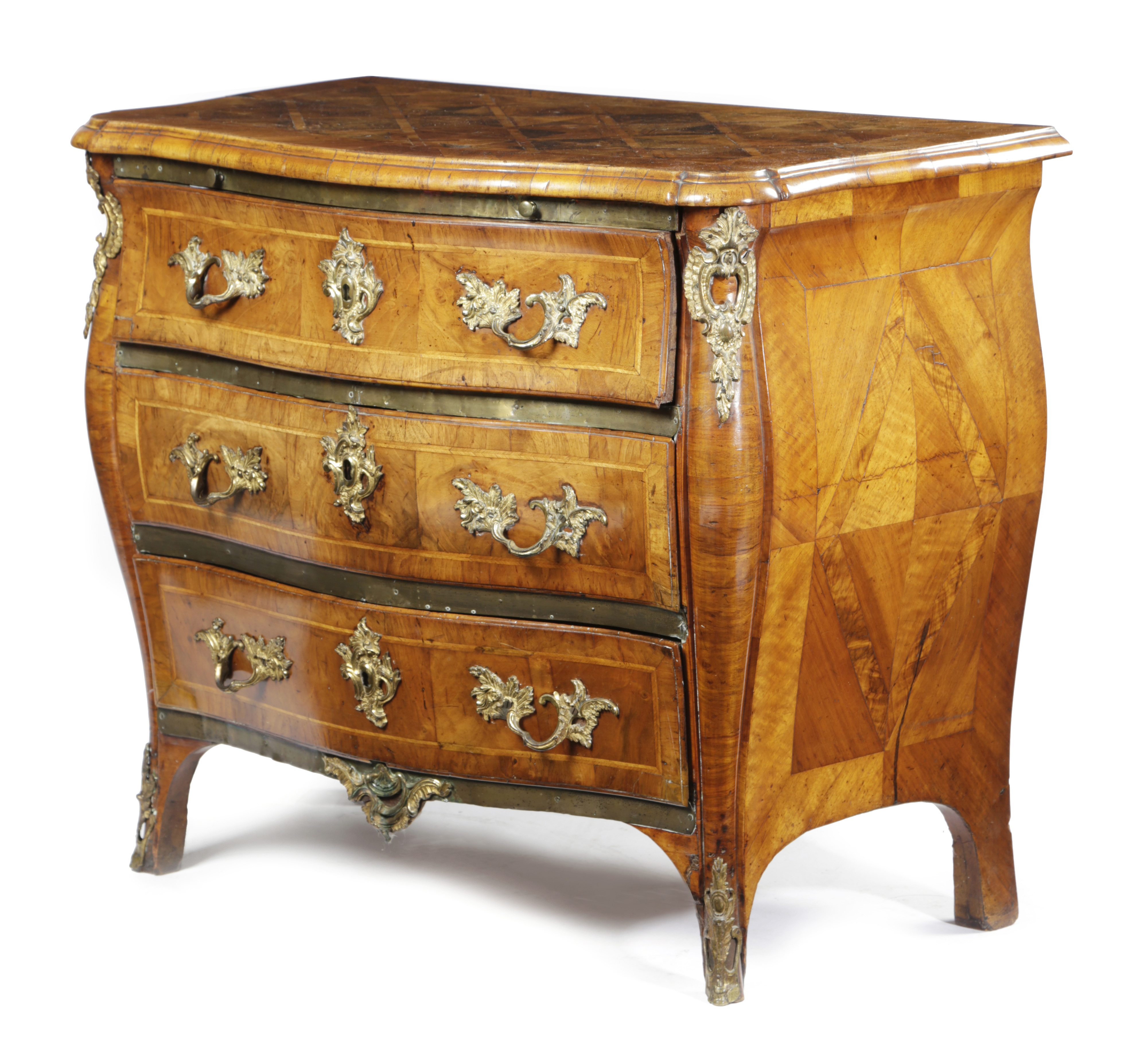 A SWEDISH ROCOCO WALNUT AND KINGWOOD BOMBE COMMODE