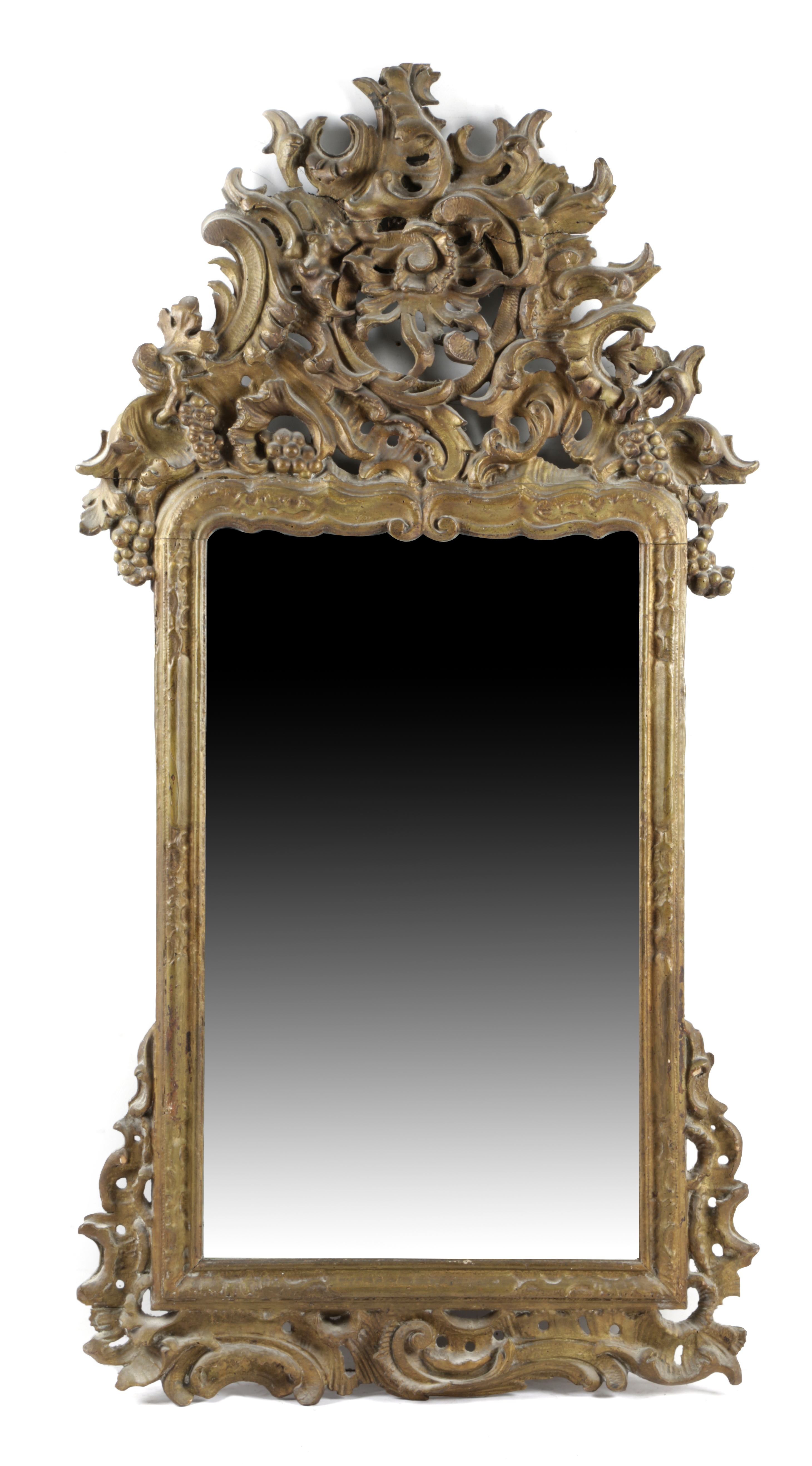 the shaped rectangular plate inside a slightly scrolling moulded frame beneath a high, Rococo style crest of 'C' scrolls and fruiting foliage