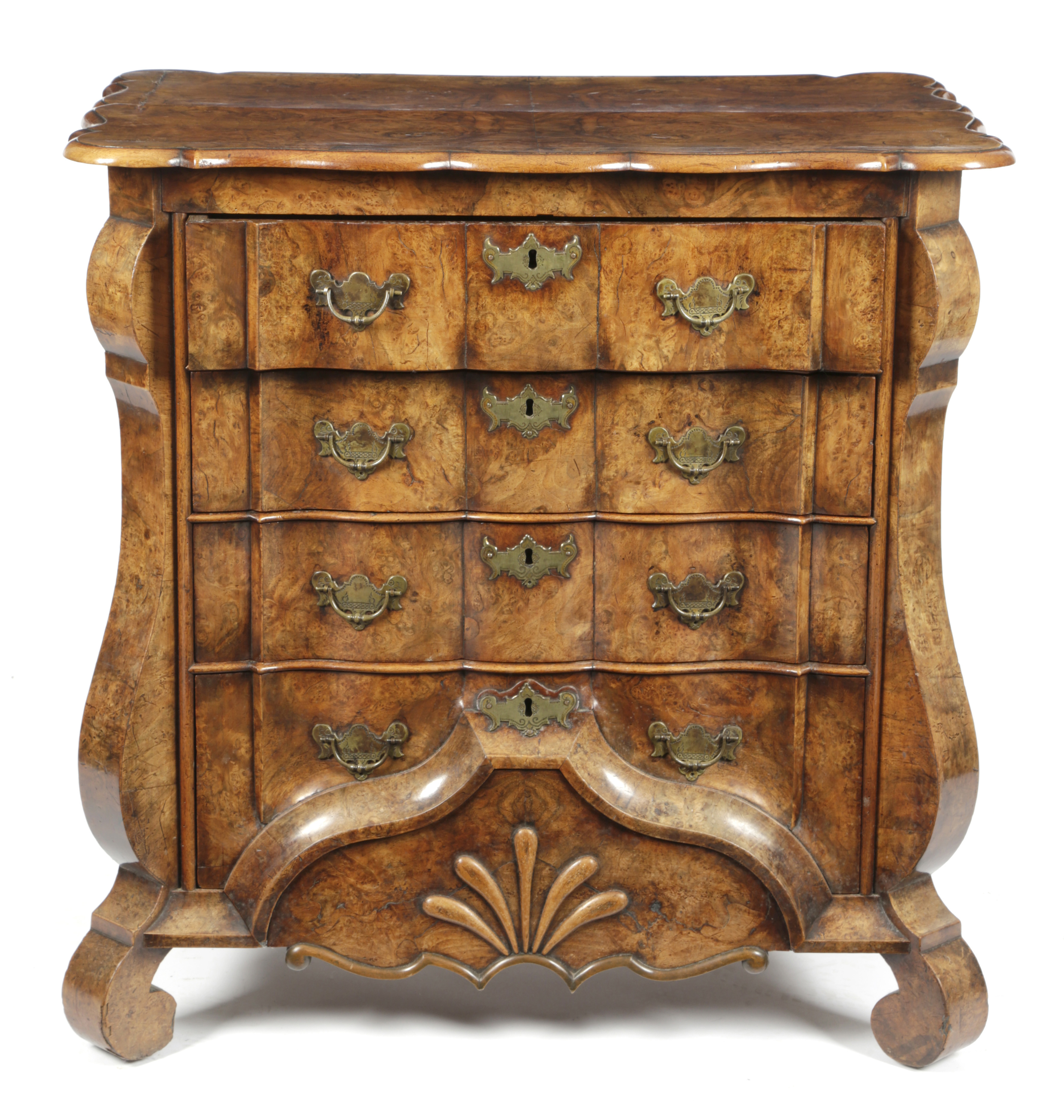 the archer's bow moulded edge top above four long ripple moulded drawers, the lowest one with a palm motif