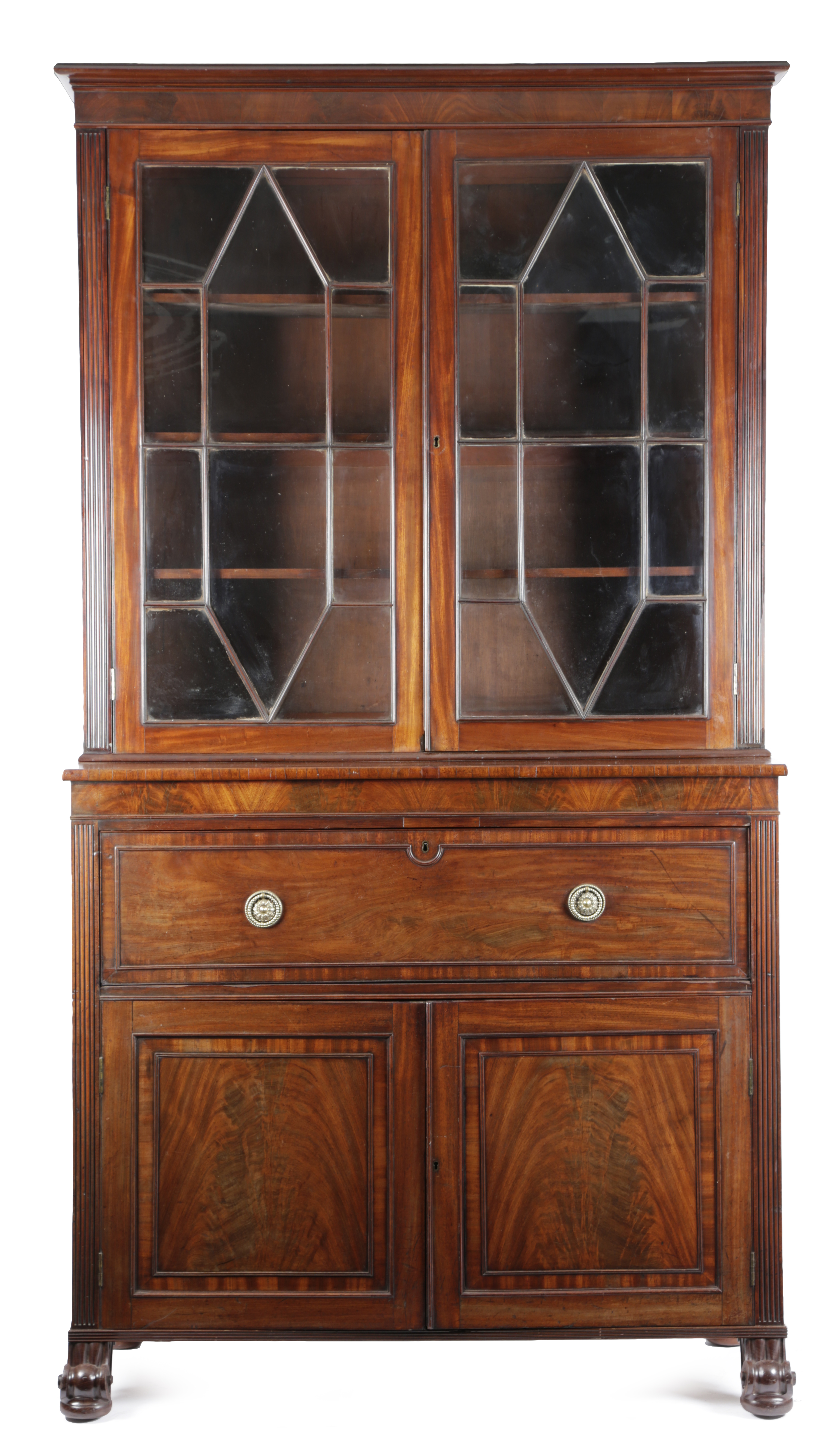 with a pair of geometric astragal glazed doors enclosing adjustable shelves to each compartment, the secretaire fitted with an arrangement of drawers with bone handles and pigeonholes and a later leather writing surface above a pair of panelled doors enclosing a shelf and three drawers, on scroll front feet