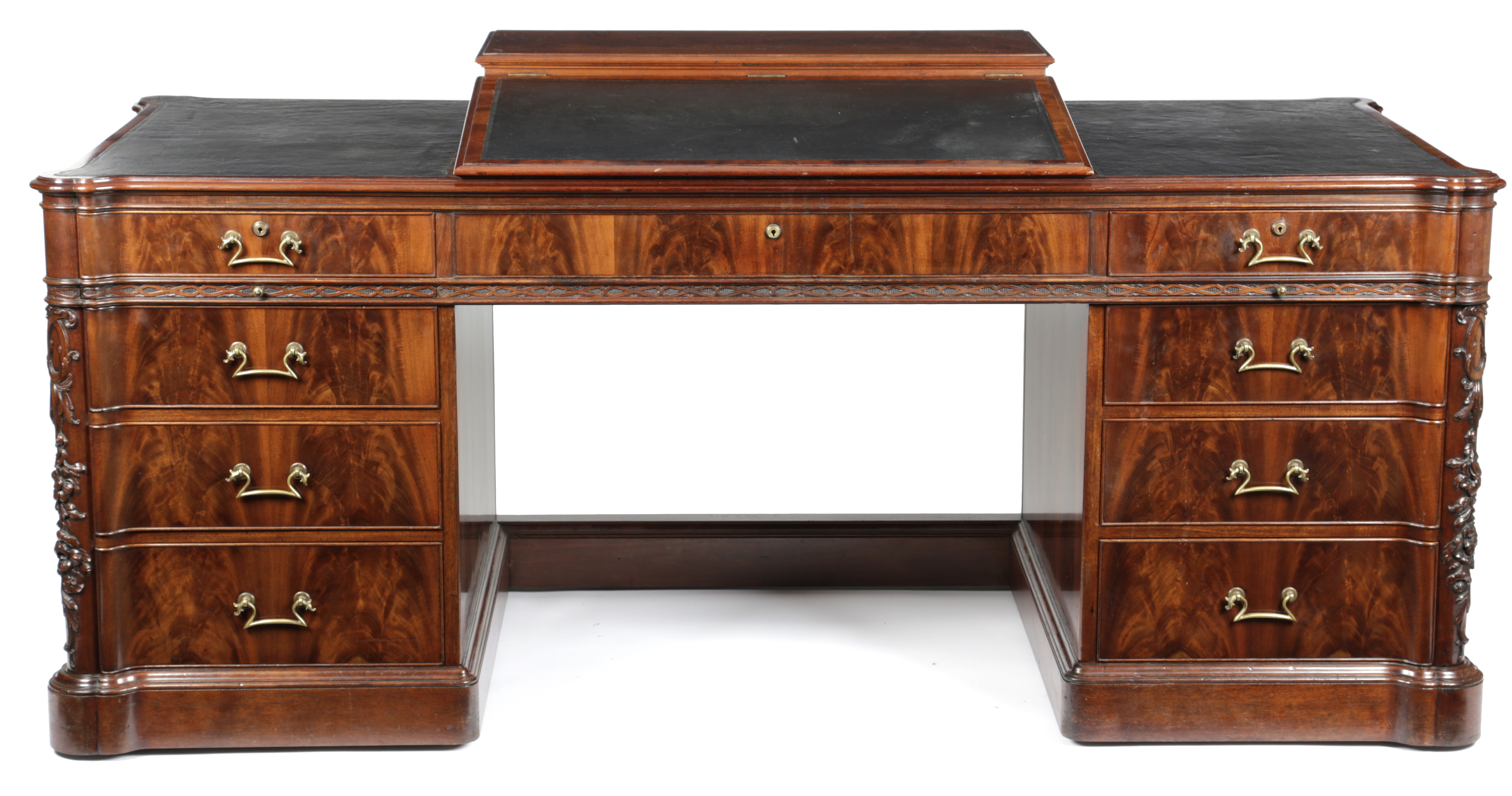 flame figured, the shaped top inset with tooled leather writing surfaces with pull-out slides, with a raised centre with a hinged slope revealing a vacant compartment, above an arrangement of nine drawers with an ingenious self- locking system with brass Bramah locks number '12 3 9' with curved corners carved with scrolling leaves and flowers, the back with a pair of cupboard doors, on castors