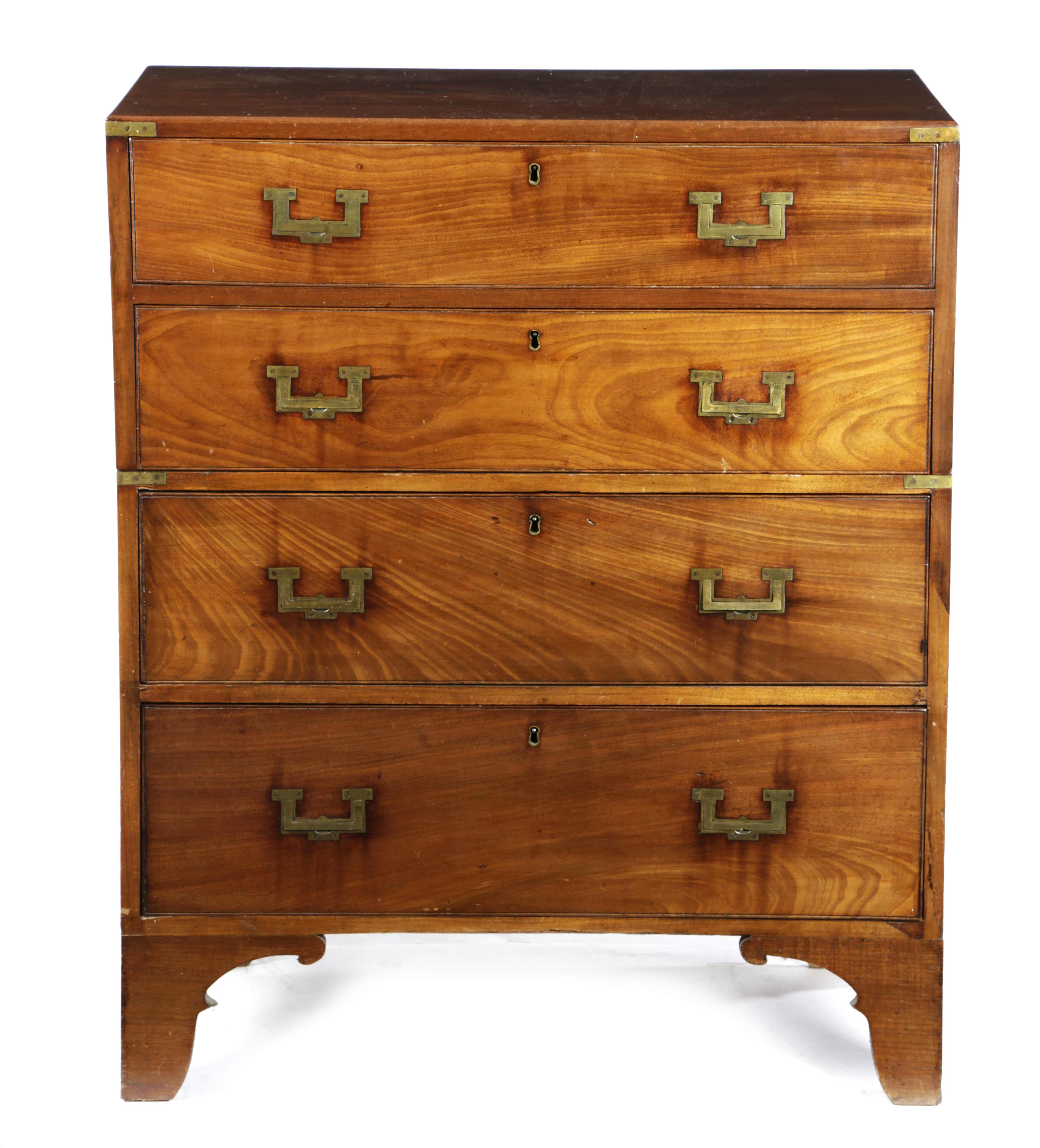 in two sections, with brass mounts and sunken handles, four long drawers and side carrying handles