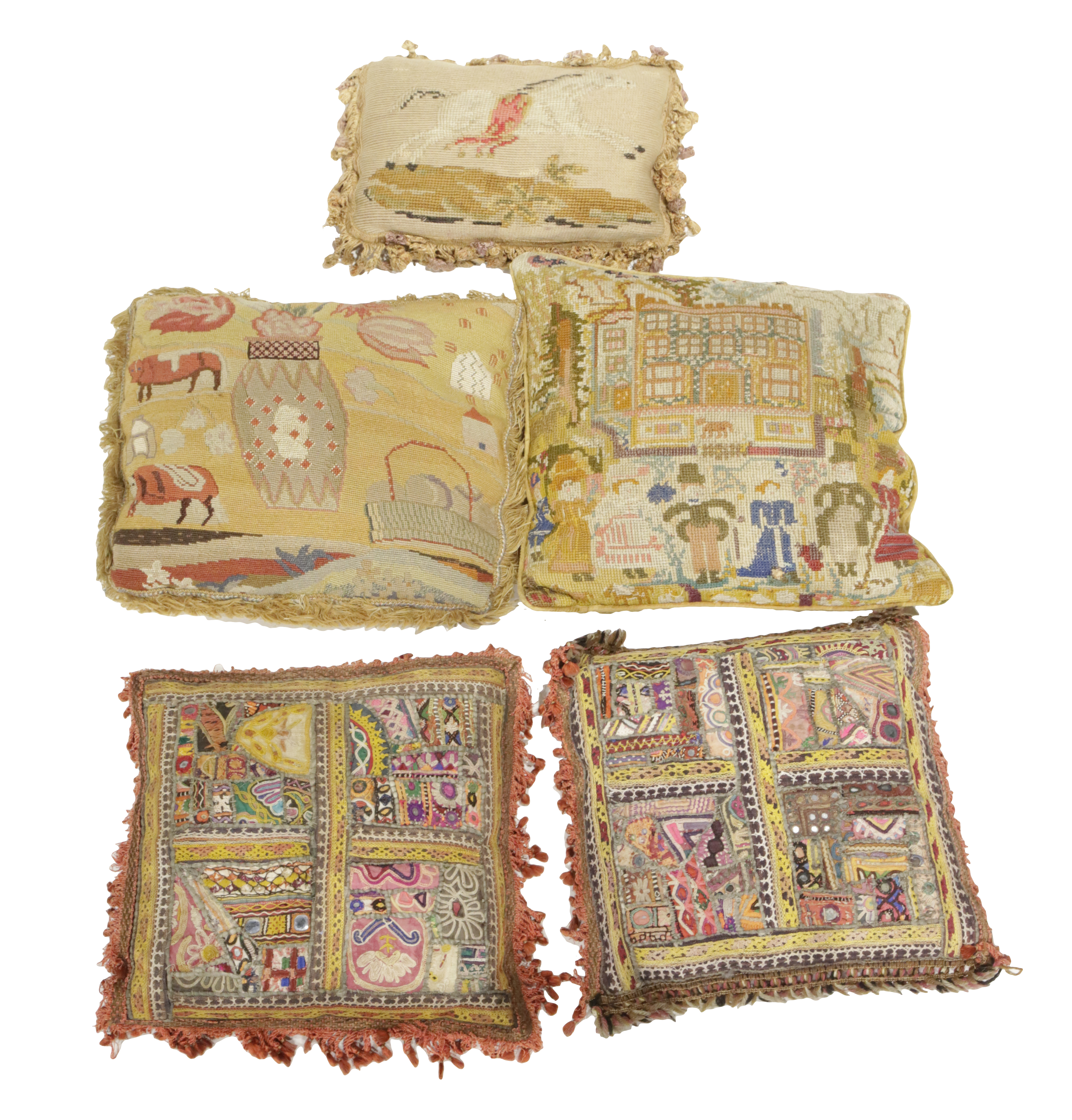the yellow ground with an urn issuing flowers surrounded by animals and houses, now as a cushion, together with four other cushions (5)