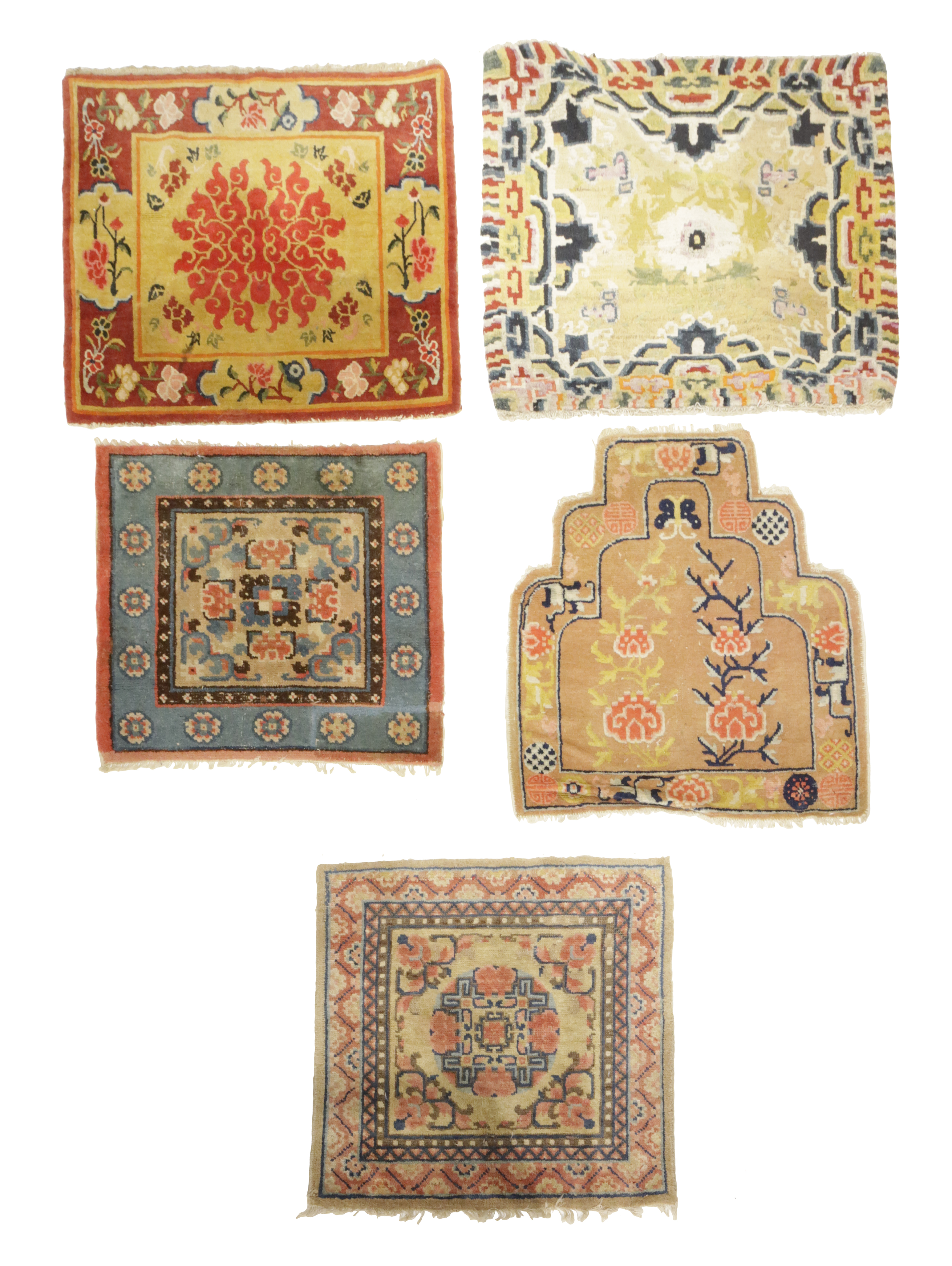 the mustard field centred by a lotus flower, enclosed by borders of floral cartouches, together with four other Tibetan chair covers and a Hamadan rug (6)
