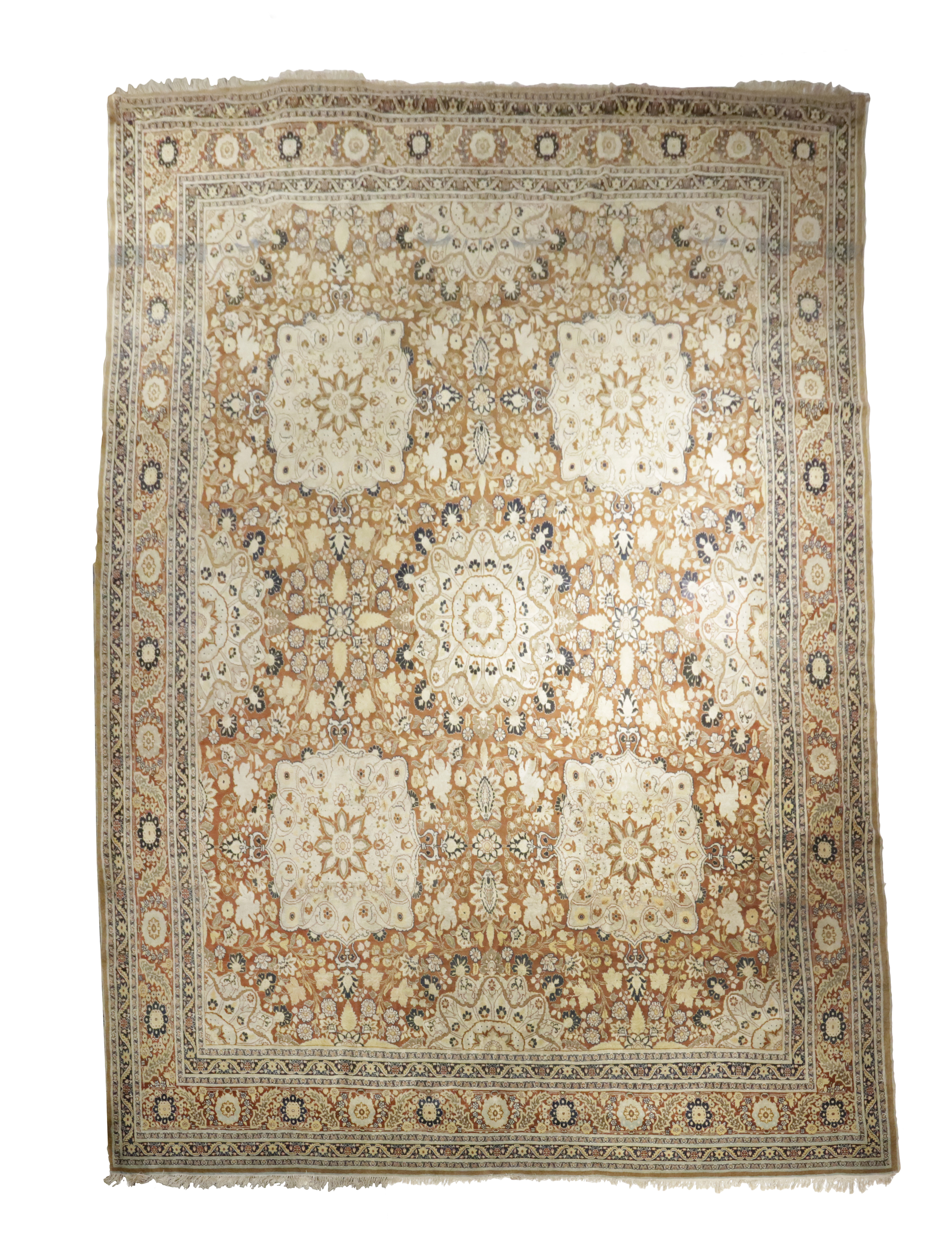 the tan field centred by flowerhead medallion surrounded by four further medallions and half medallions, framed by spandrels and borders of rosettes and serrated leafy floral vines, flanked by meandering vine and carnation guard stripes