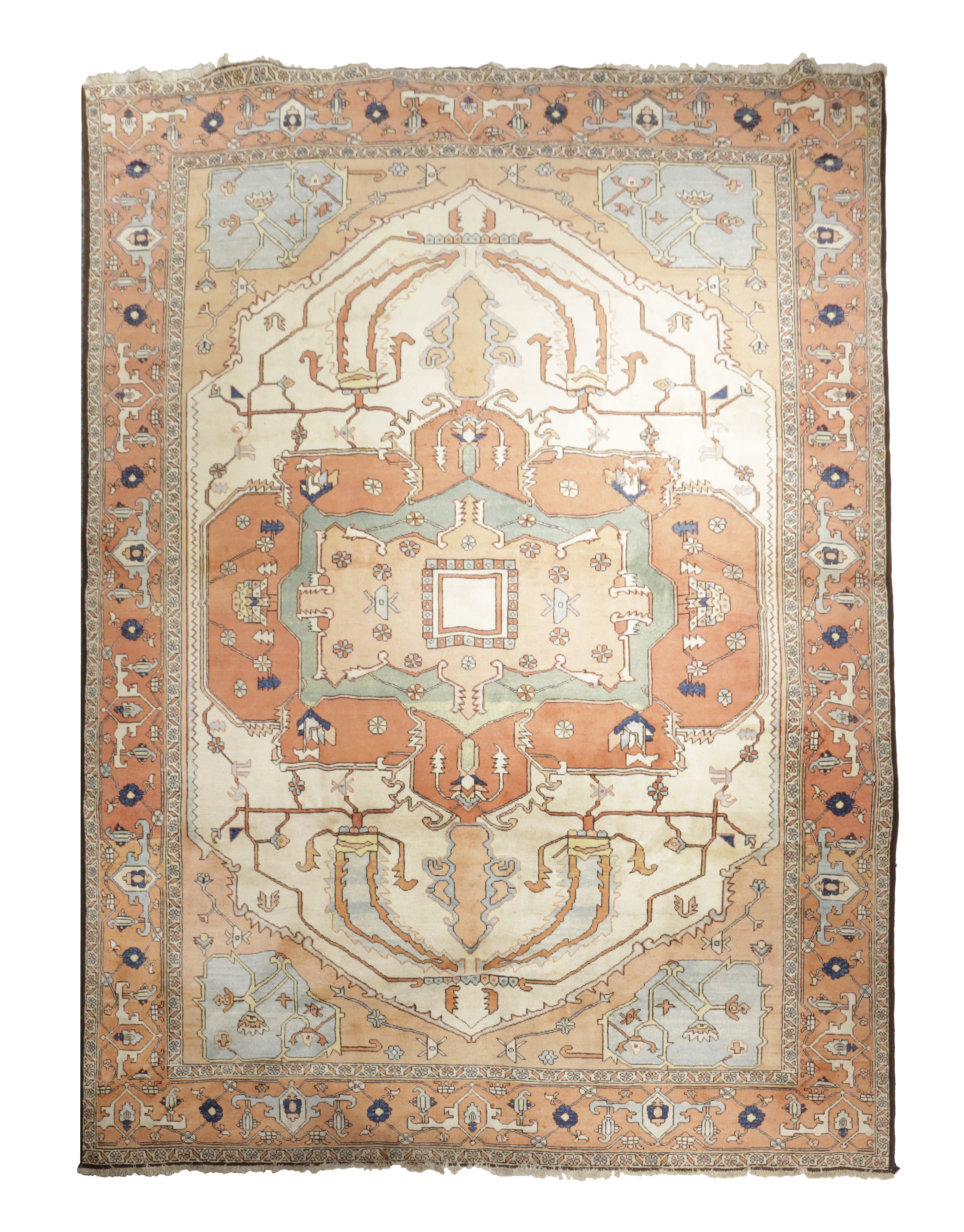 the ivory field of large serrated leaves and angular vines centred by a pale terracotta and mint medallion enclosed by spandrels and terracotta borders of samovar motifs flanked by carnation guard stripes