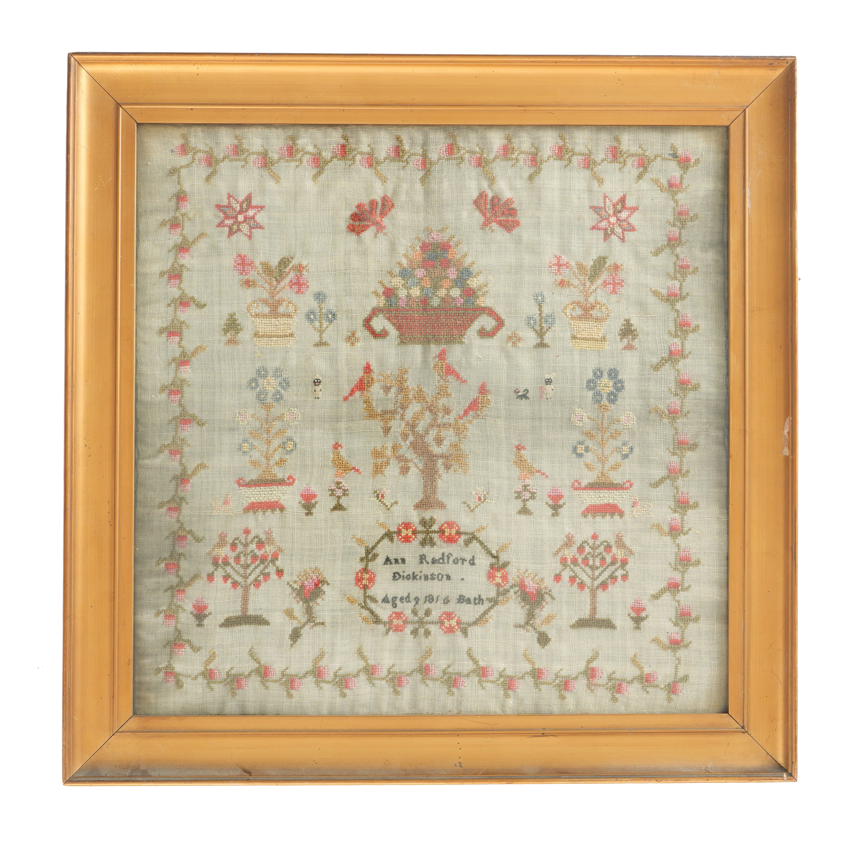 worked in colours with vases of flowers above a tree with birds, a pair of small blackamoors, further plants and animals above the floral cartouche inscribed 'Ann Radford Dickinson Aged 9 1816 Bath', inside a floral border, in a glazed gilt frame
