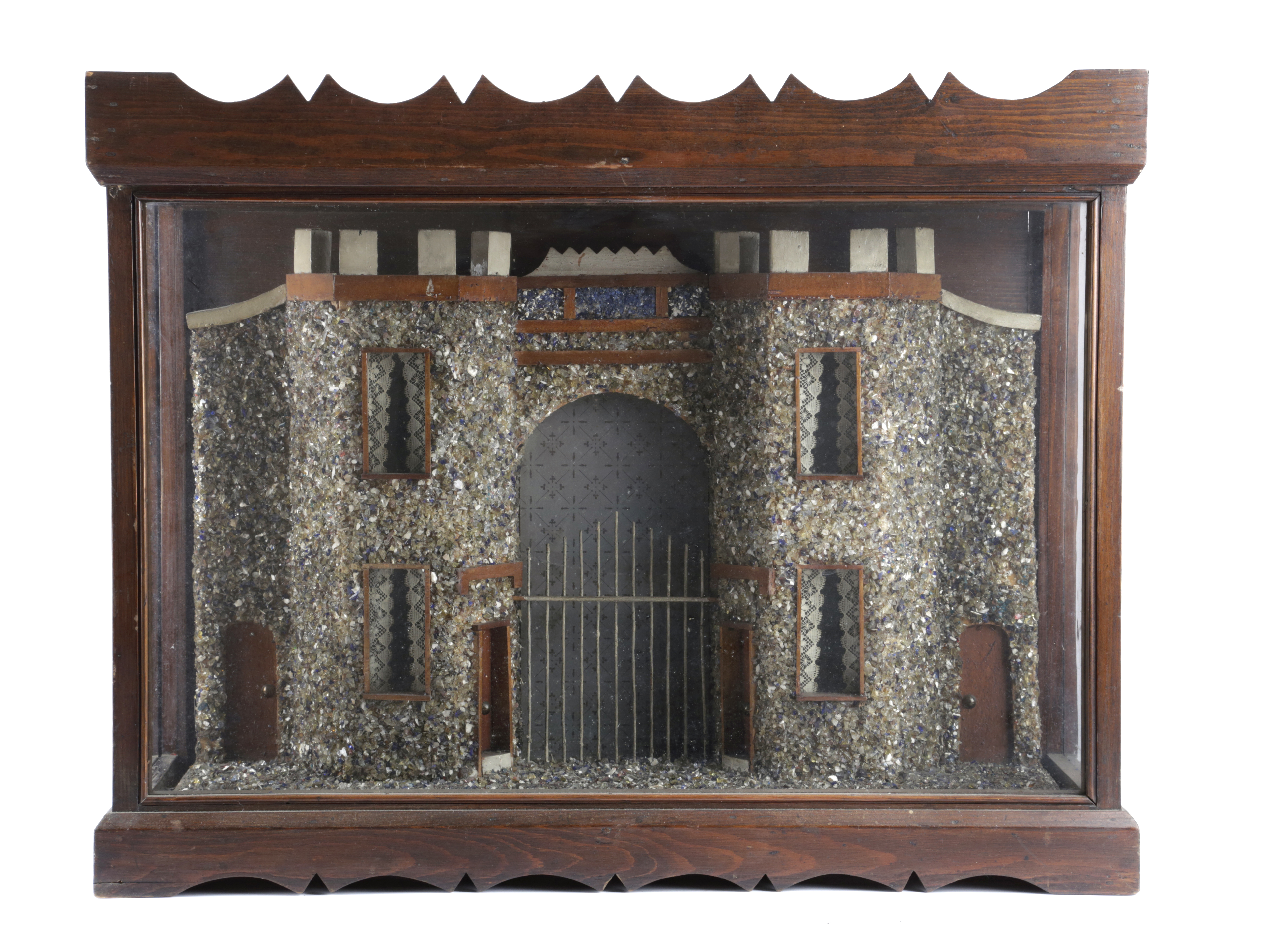 probably modelled on the gate house at Brereton Hall Cheshire, decorated with glass and stone fragments, in a glazed stained pine case