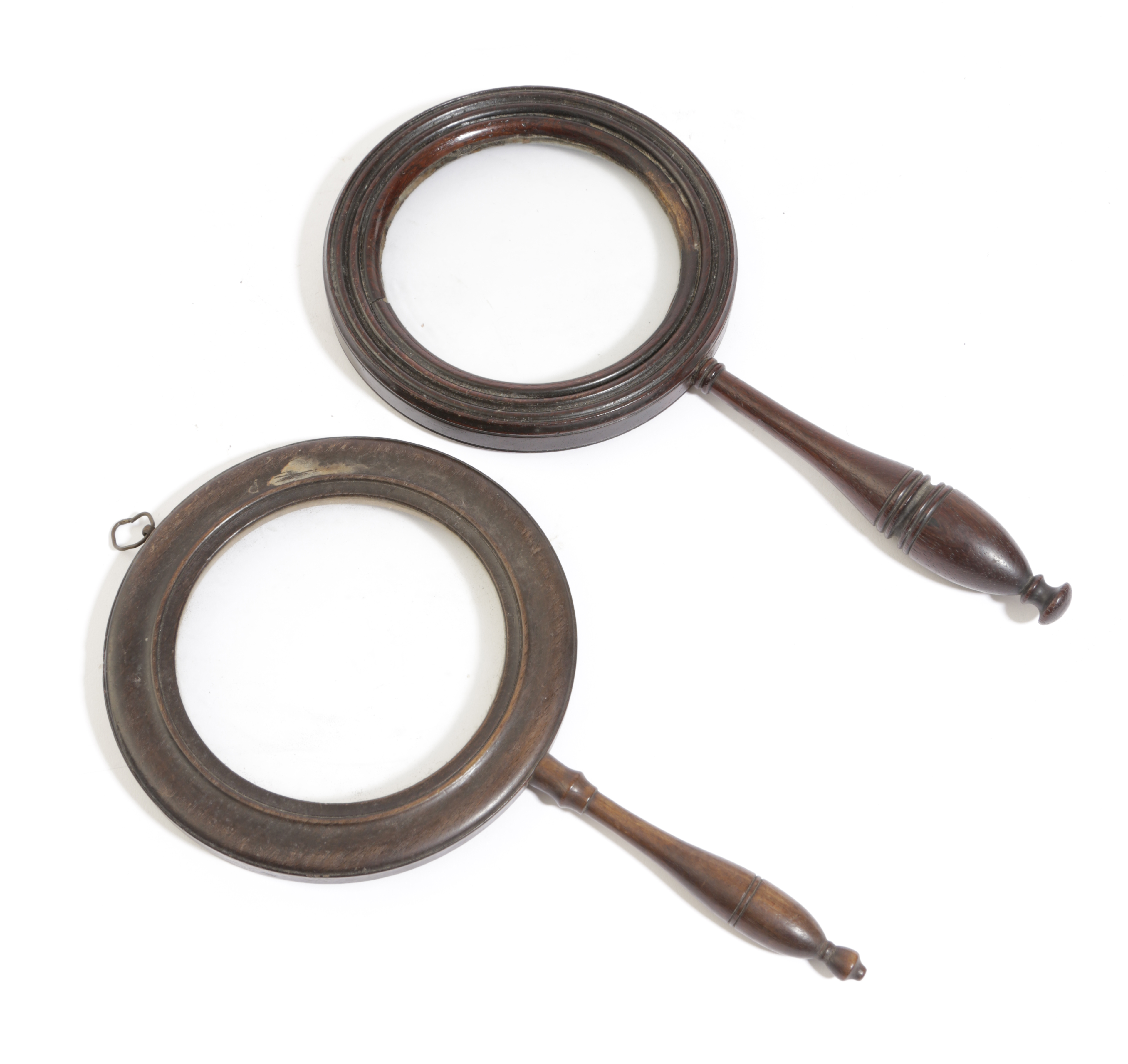 with a moulded frame and turned mahogany handle, together with another mahogany gallery glass with a turned handle (2)