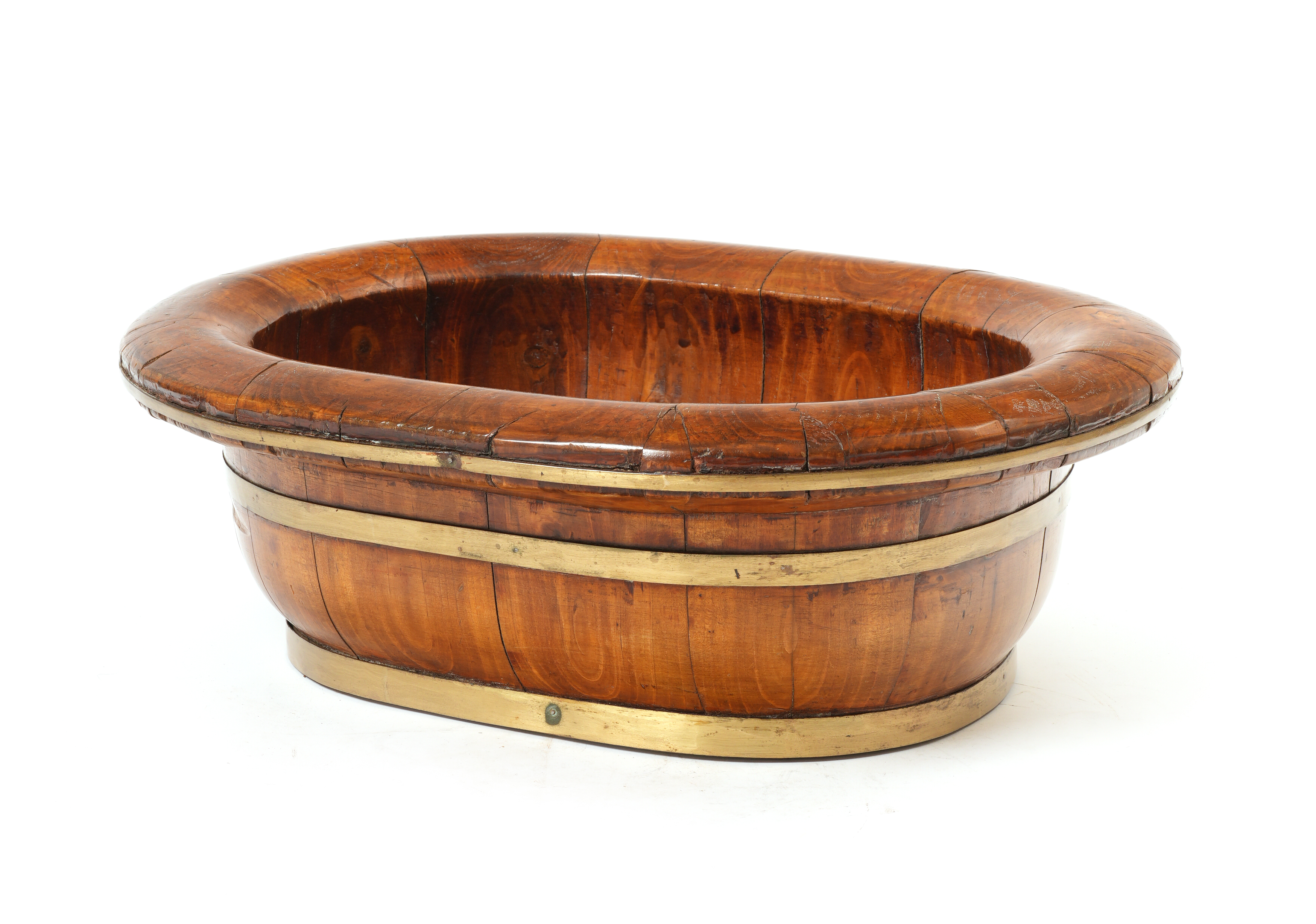 of oval form with a broad rolled-over, oyster-effect rim and brass bands